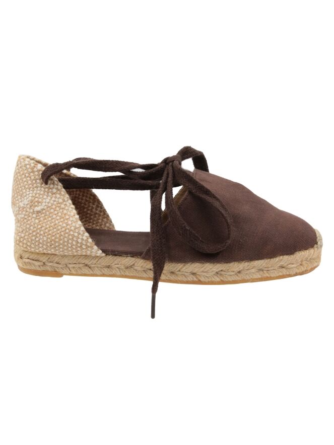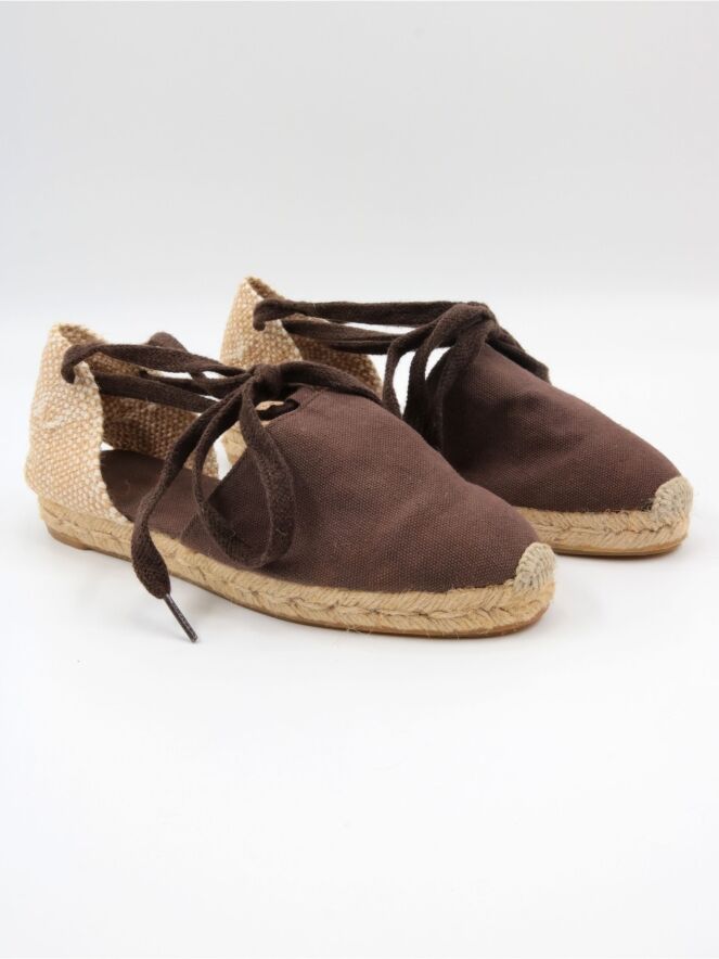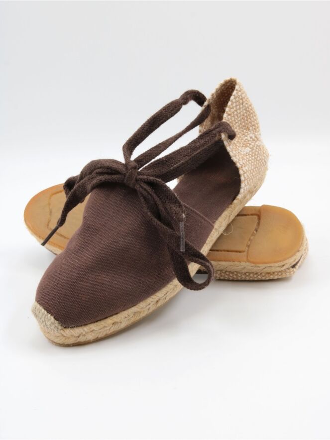 Eine flache Espadrille von Castagner in Mokkabraun. Das Fersenband ist in Weiß und Beige geflochten.