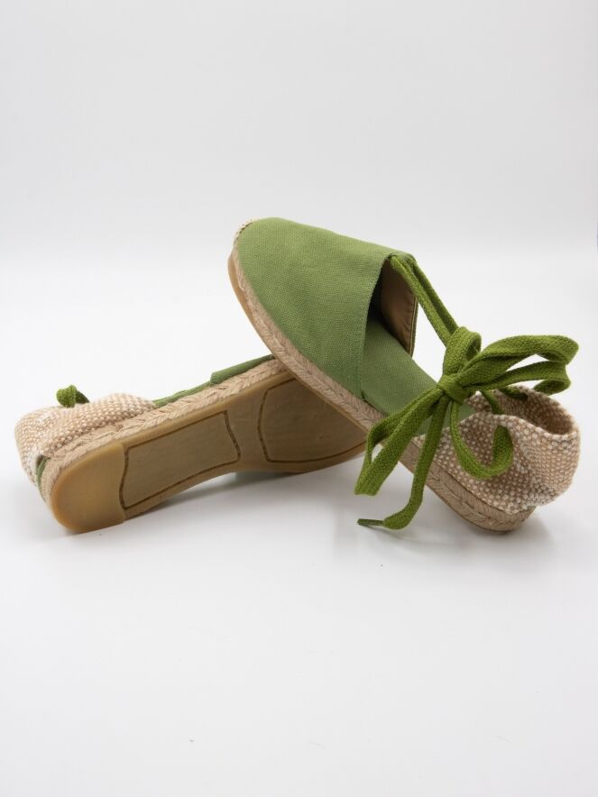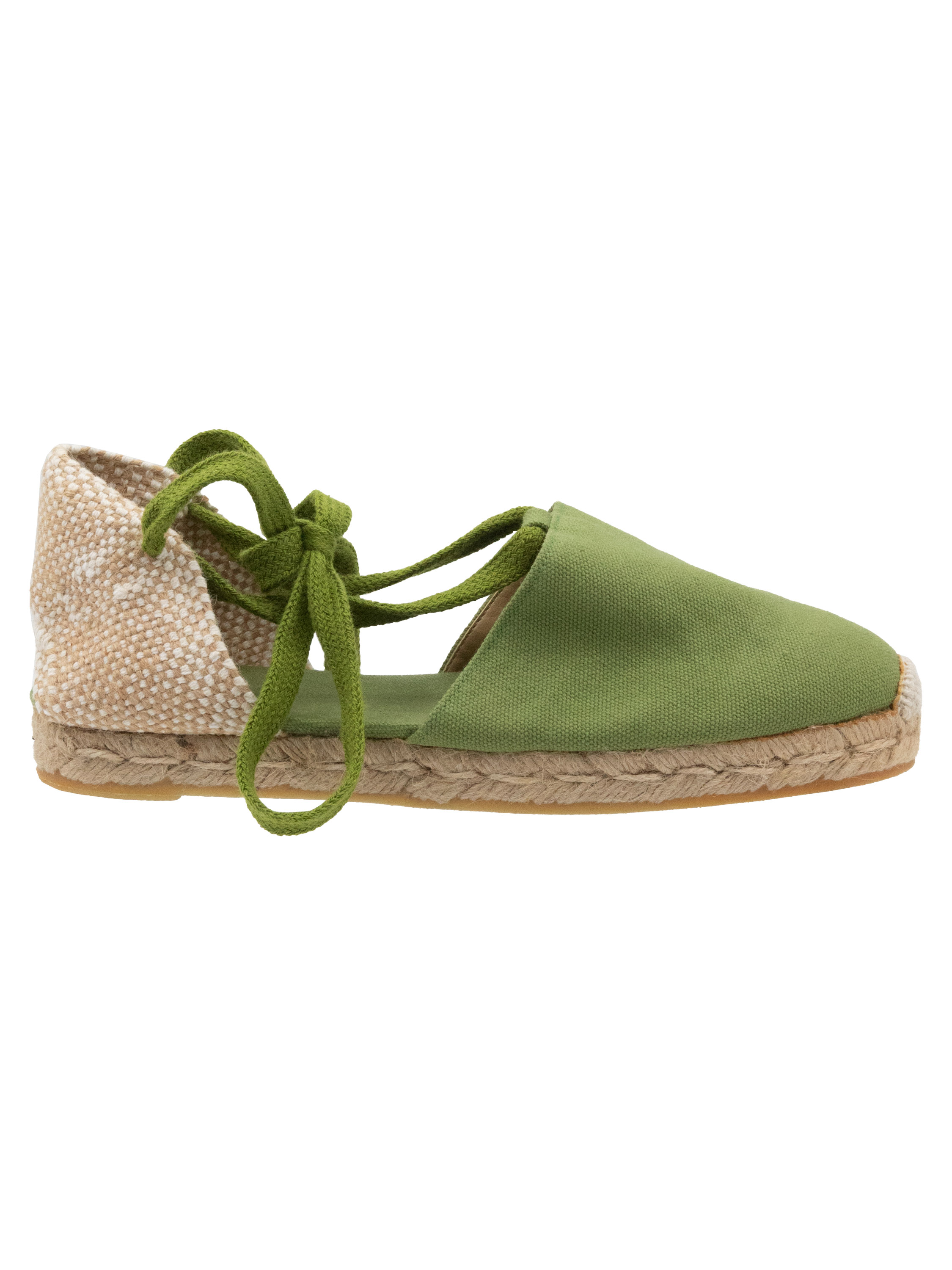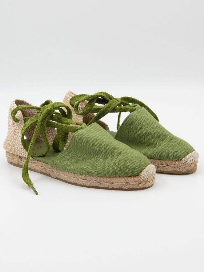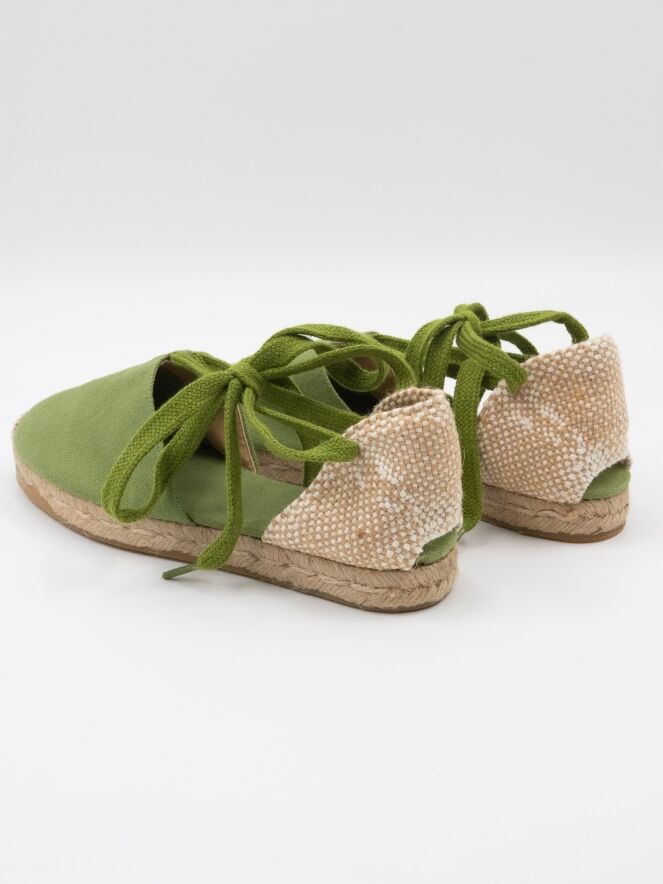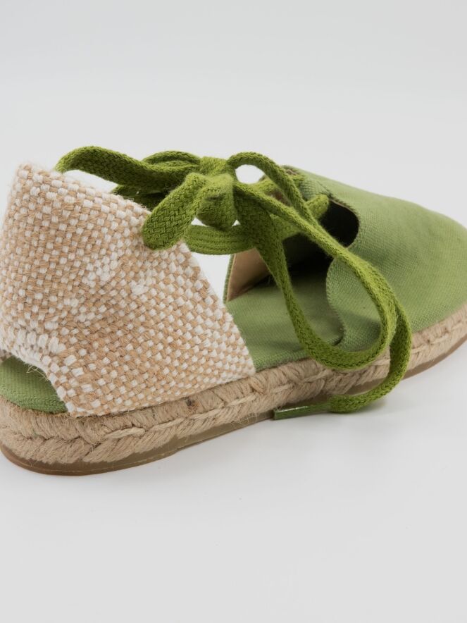 Eine flache Espadrille von Castagner in Pistaziengrün. Das Fersenband ist in Weiß und Beige geflochten.