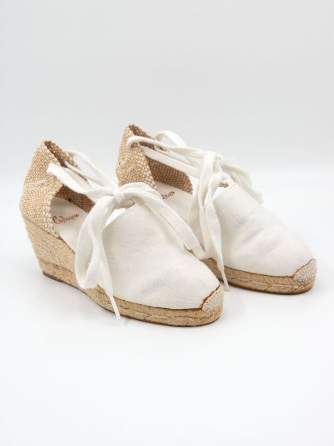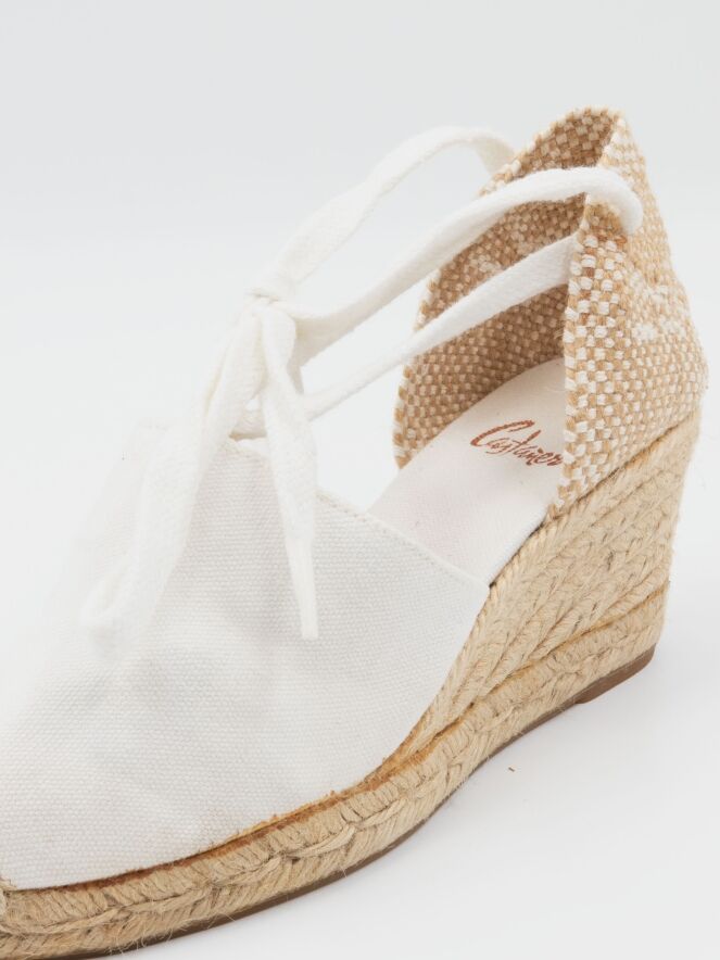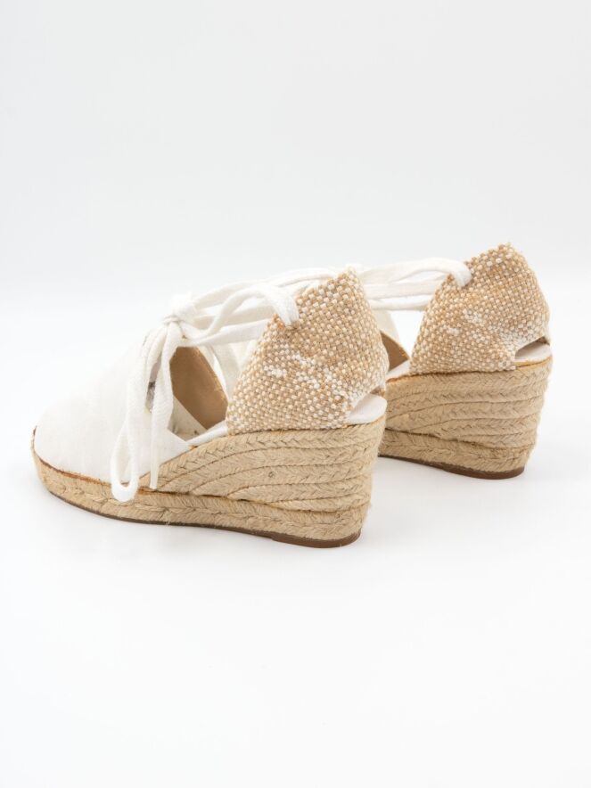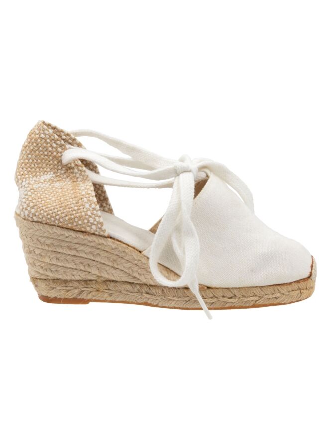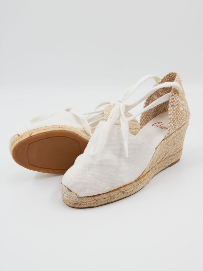 Espadrille von Castagner mit einem mittelhohen Keilabsatz in Cremeweiß. Der Fersenriemen ist in Weiß und Beige geflochten.