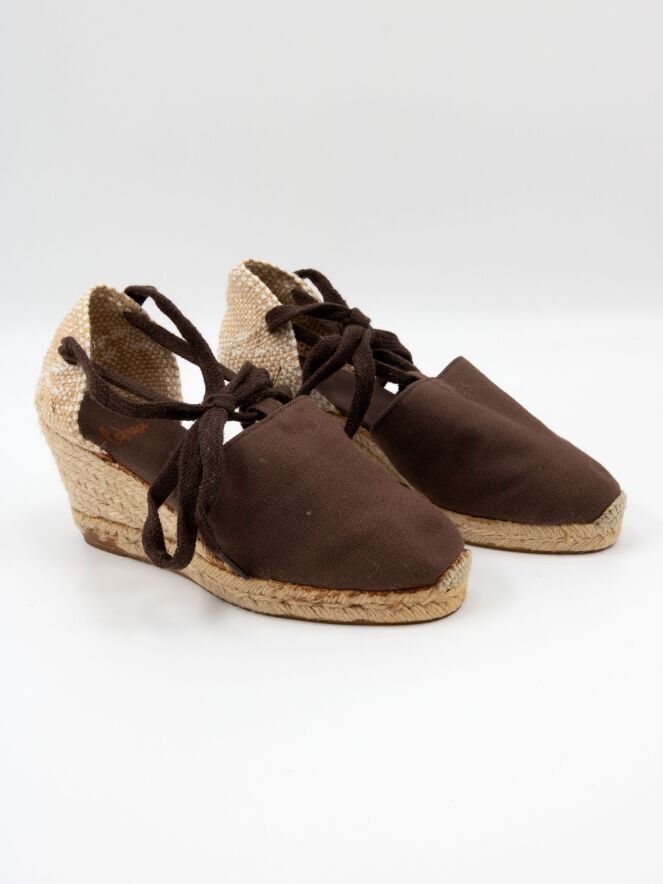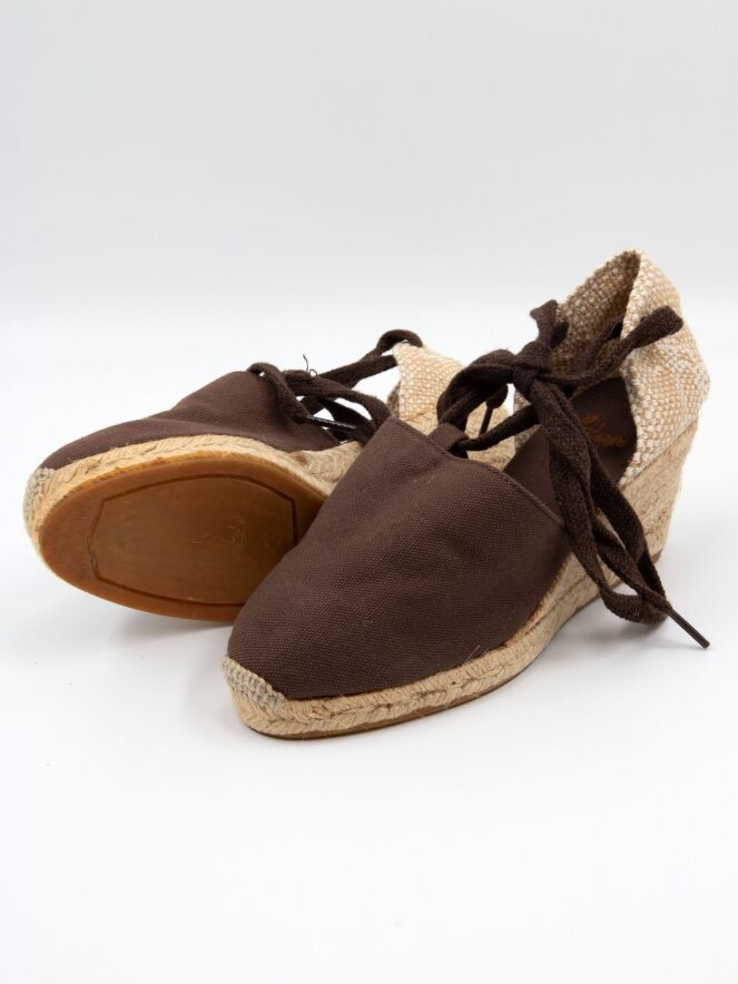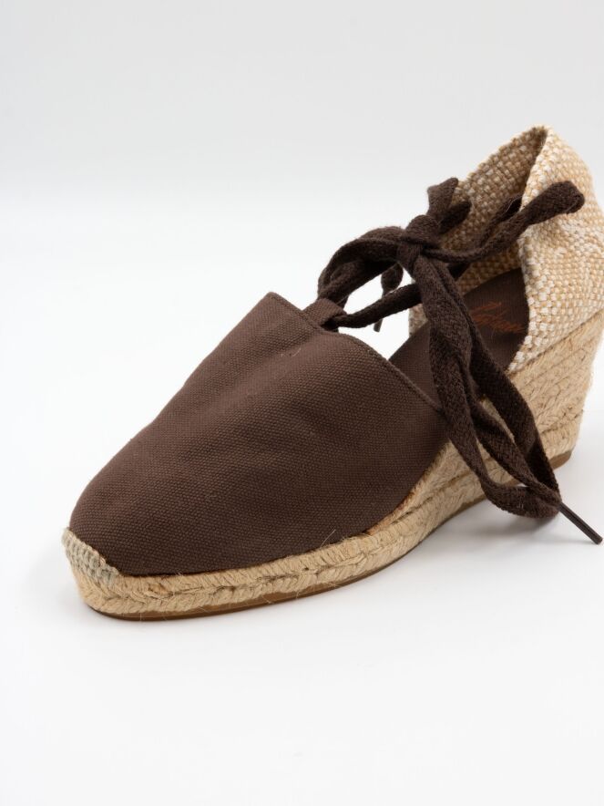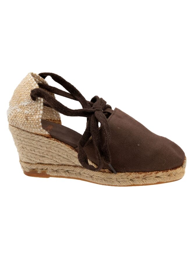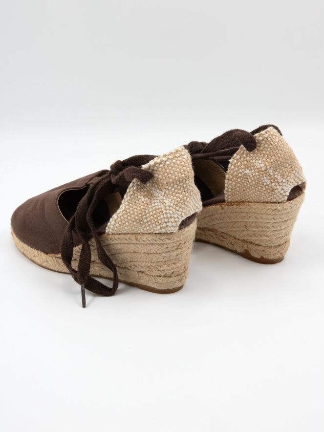 Eine Espadrille von Castagner mit einem mittelhohen Keilabsatz in Mokkabraun. Das Fersenband ist in Weiß und Beige geflochten.