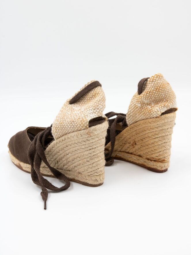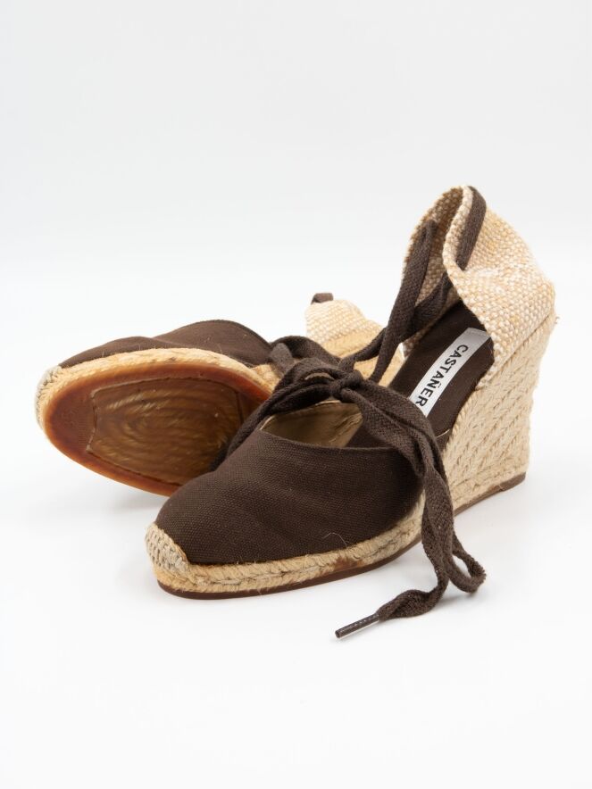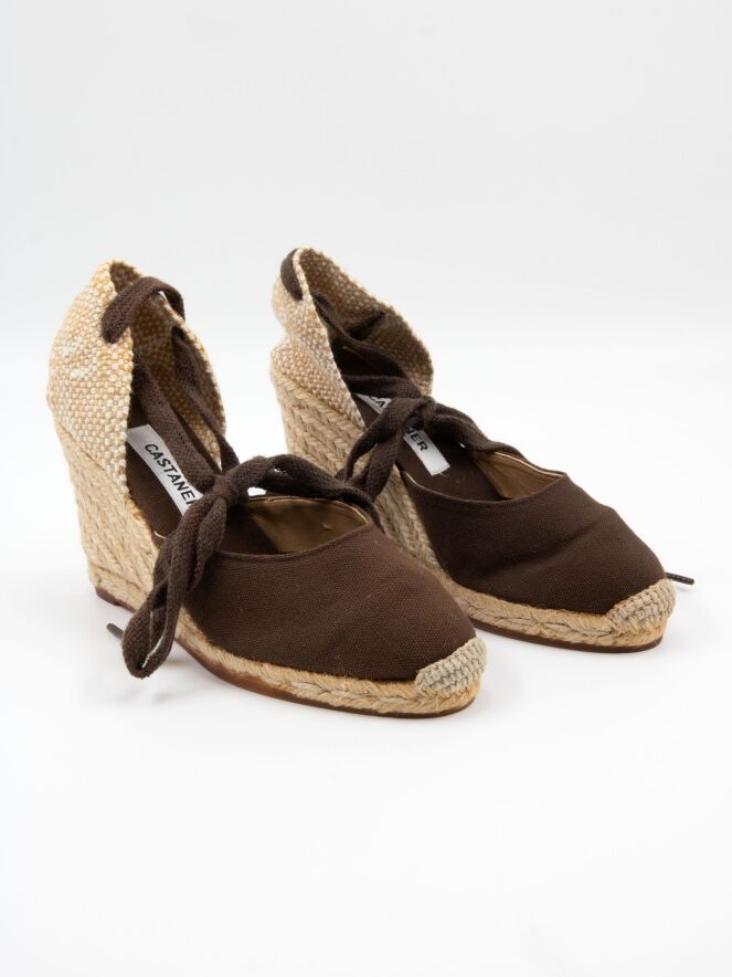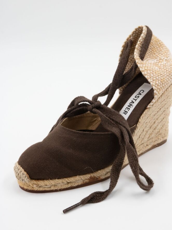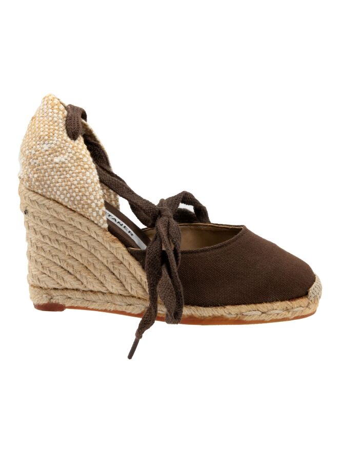 Eine Espadrille von Castagner mit einem hohen Keilabsatz in Mokkabraun. Das Fersenband ist in Weiß und Beige geflochten.