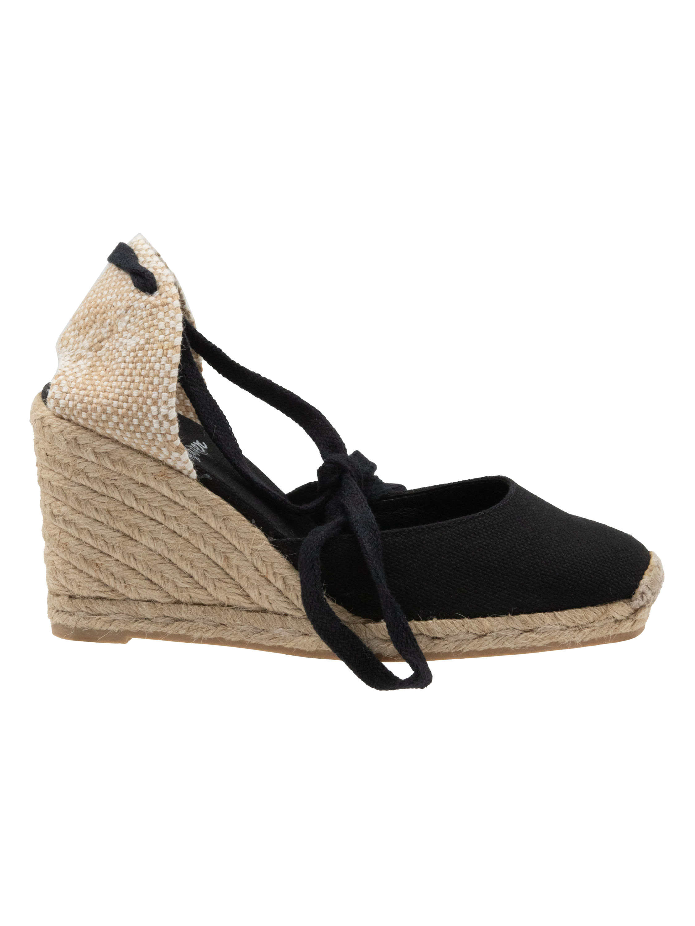 Eine Espadrille von Castagner mit einem hohen Keilabsatz in Schwarz. Das Fersenband ist in Weiß und Beige geflochten.