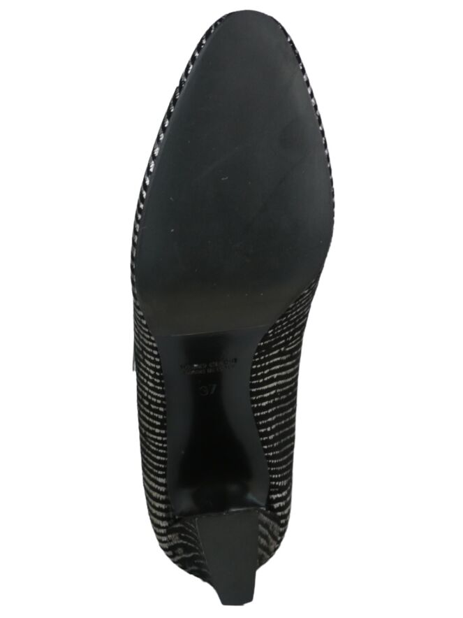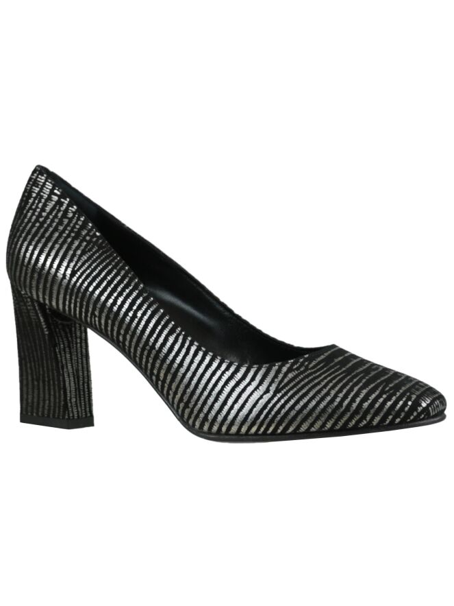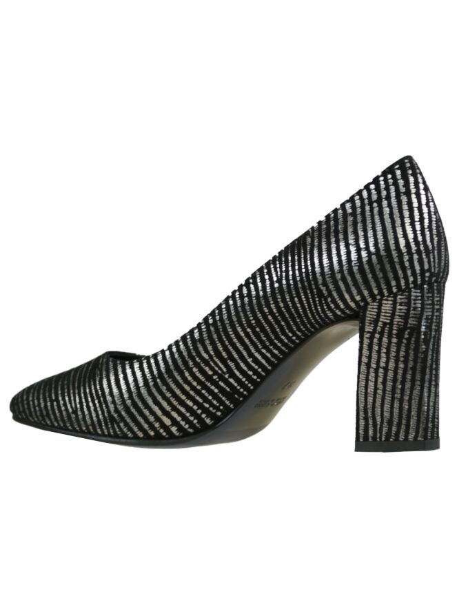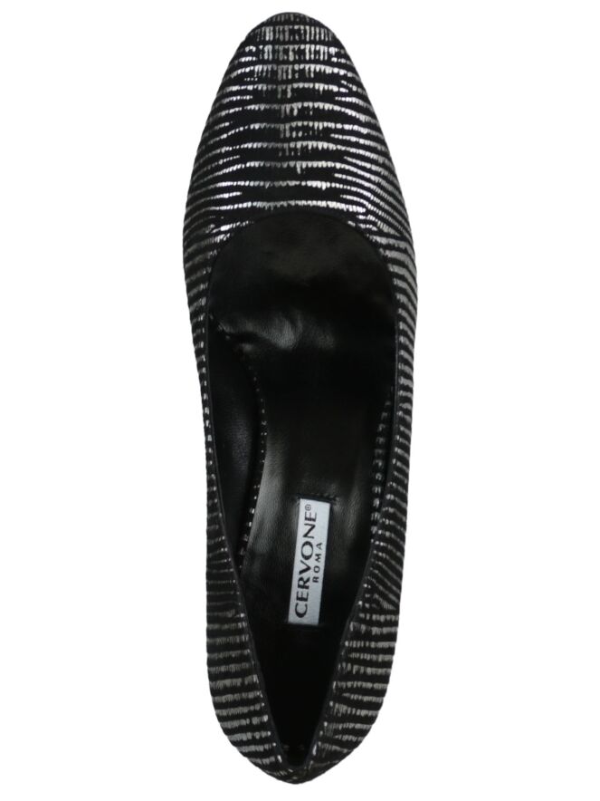 Pumps der Designerschuhmarke Cervone mit graphischem Streifenmuster in Schwarz mit Silber. Der vorn abgerundete Pumps ist mit einem eleganten Blockabsatz versehen. Das Innenfutter ist aus Leder.