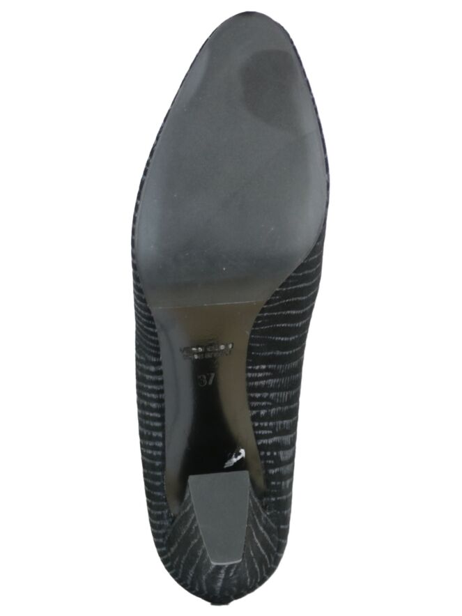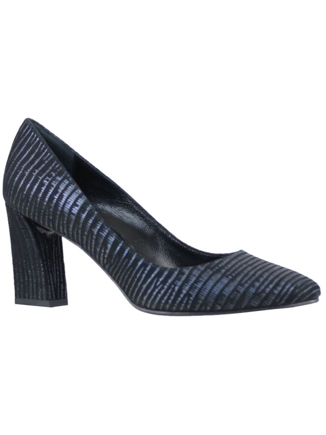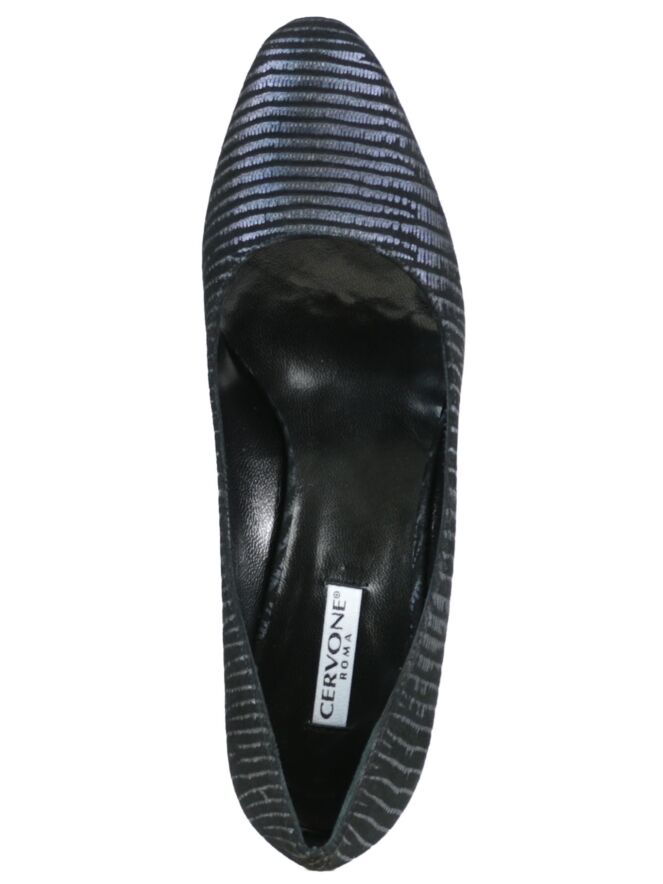 Pumps der Designerschuhmarke Cervone mit graphischem Streifenmuster in Marineblau mit Nachtblau. Der vorn abgerundete Pumps ist mit einem eleganten Blockabsatz versehen. Das Innenfutter ist aus Leder.