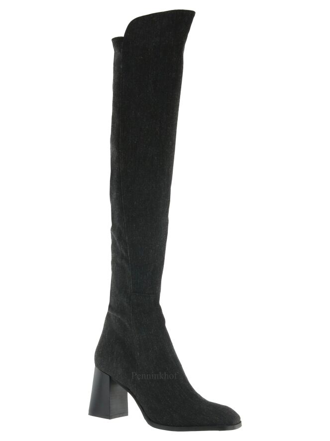 Ein schmaler hoher Stiefel der Schuhmarke Cervone aus einem anthrazitfarbenen Mischgewebe. Der Stoff ist elastisch und passt sich dem Bein an. Der Stiefel kommt mit einem hölzernen Blockabsatz. Der Schaft ist teilweise mit Leder gefüttert.