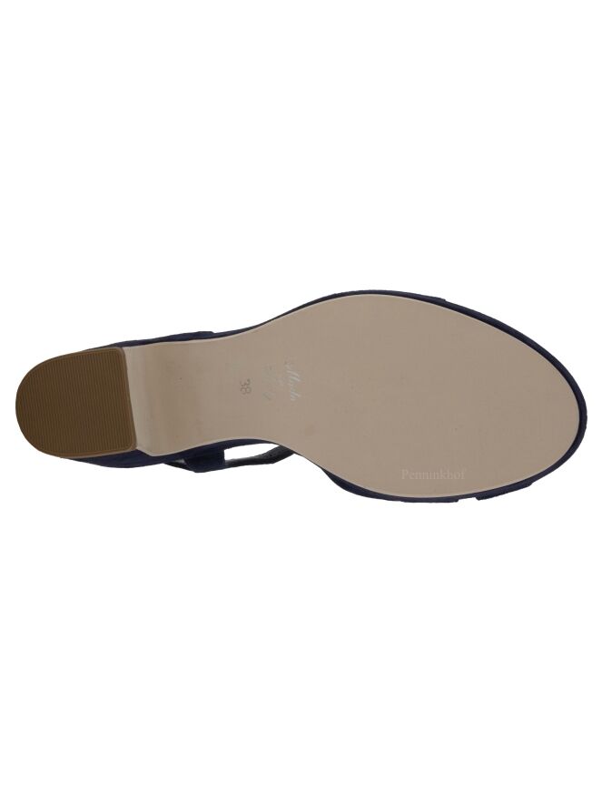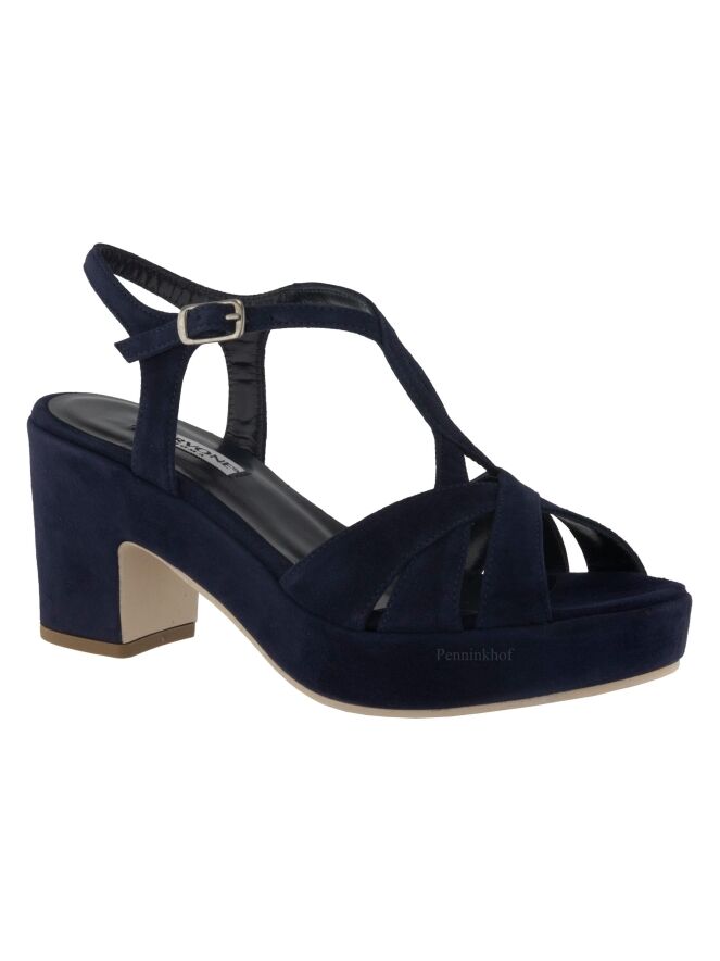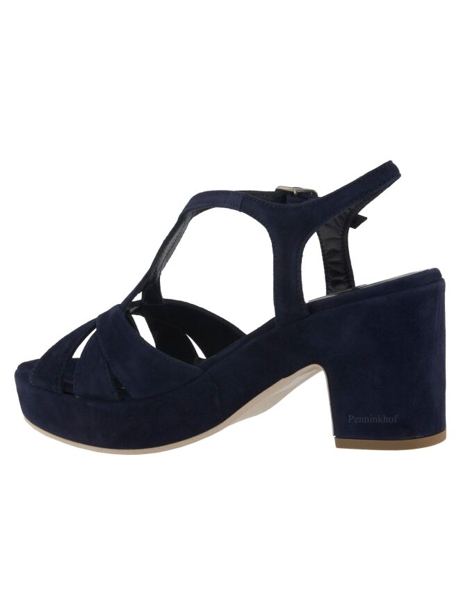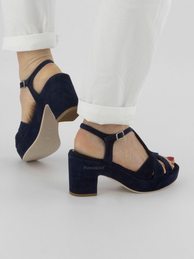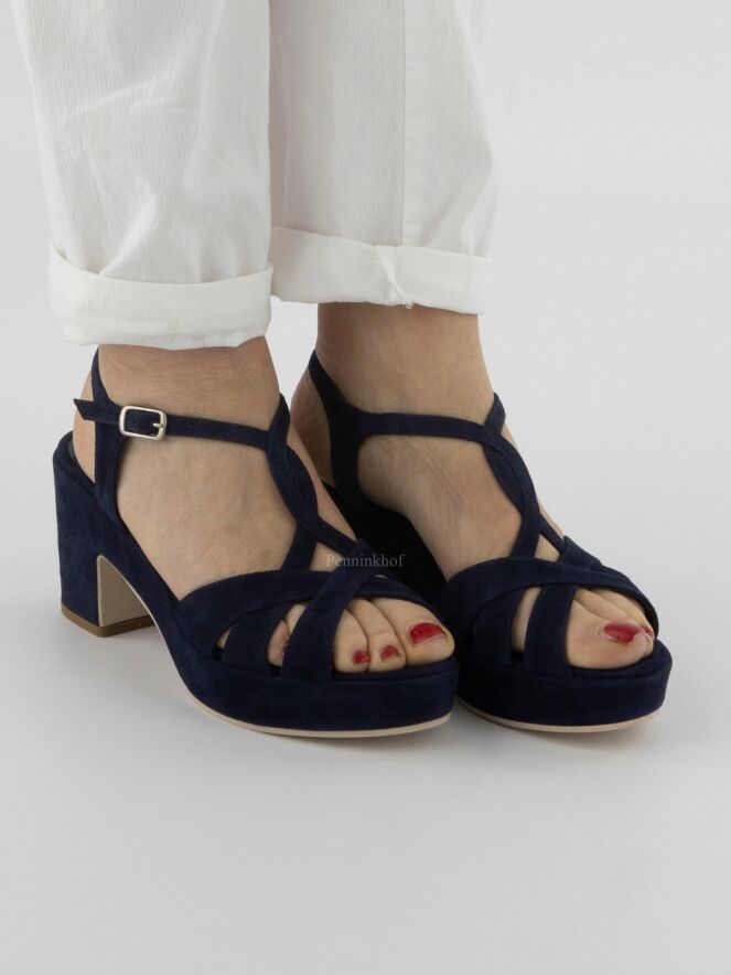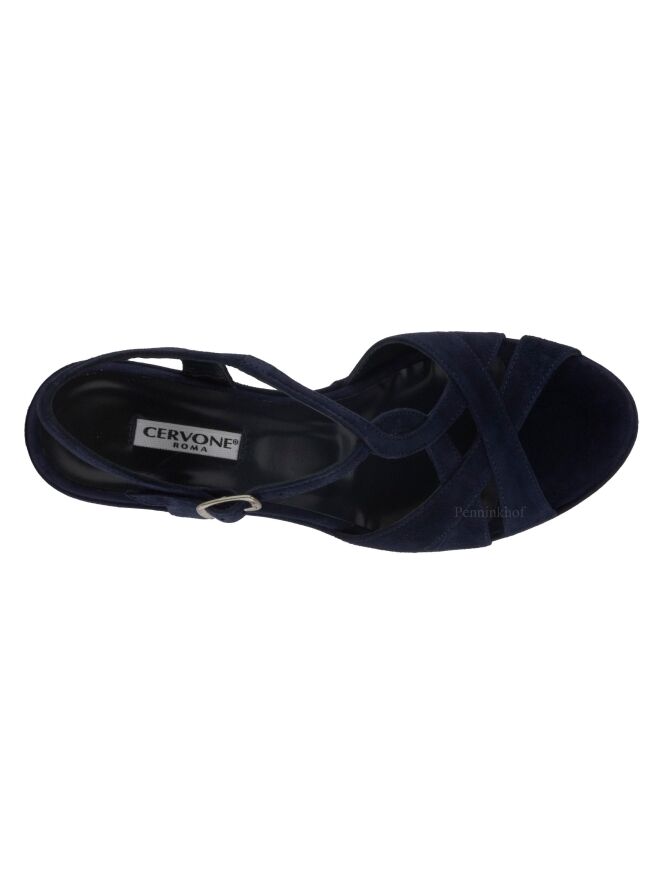 Eine offene Plateausandale der Schuhmarke Cervone in Nachtblau. Auf dem vorderen Fußteil befinden sich drei überkreuzte Riemen. Vom vorderen Fußteil verläuft ein verstellbarer Riemen an den Seiten des Fußes bis zur Ferse. Der Absatz ist mit dem gleichen Material wie die Sandale bezogen.