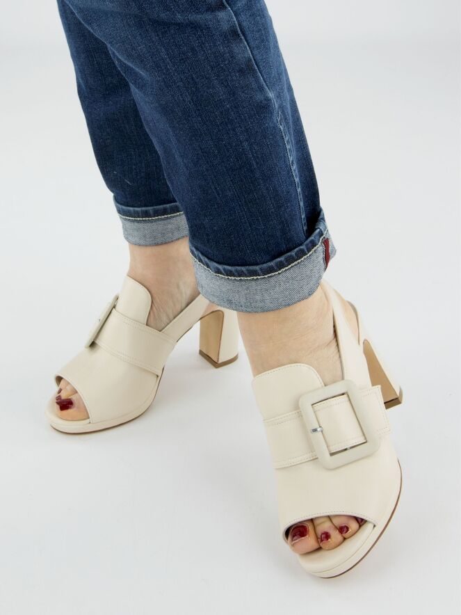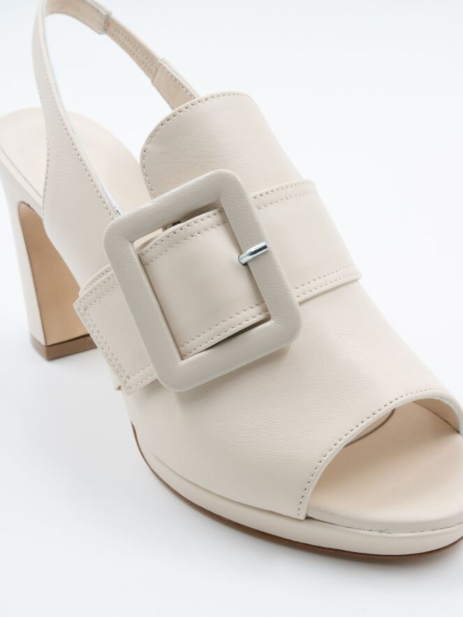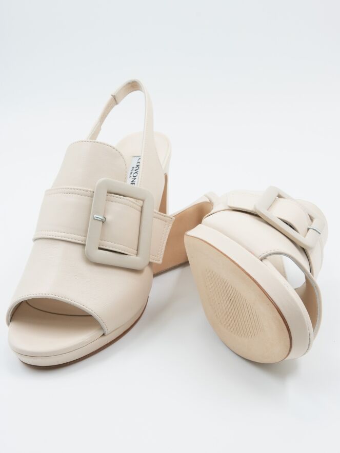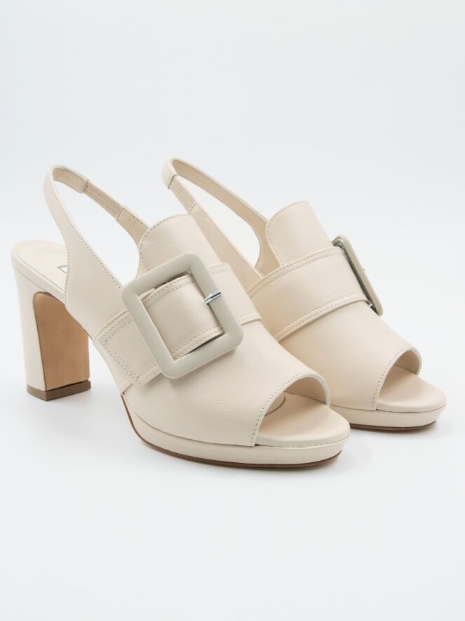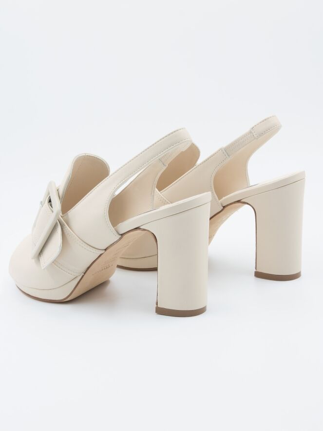 Ein offener Pump von Cervone in einer cremeweißen Farbe. Über dem Vorfuß befindet sich eine große rechteckige Schnalle in derselben Farbe wie der Schuh. Der Pump hat eine offene Spitze, und der Fersenriemen hat einen elastischen Teil.