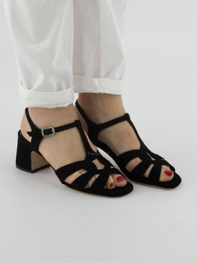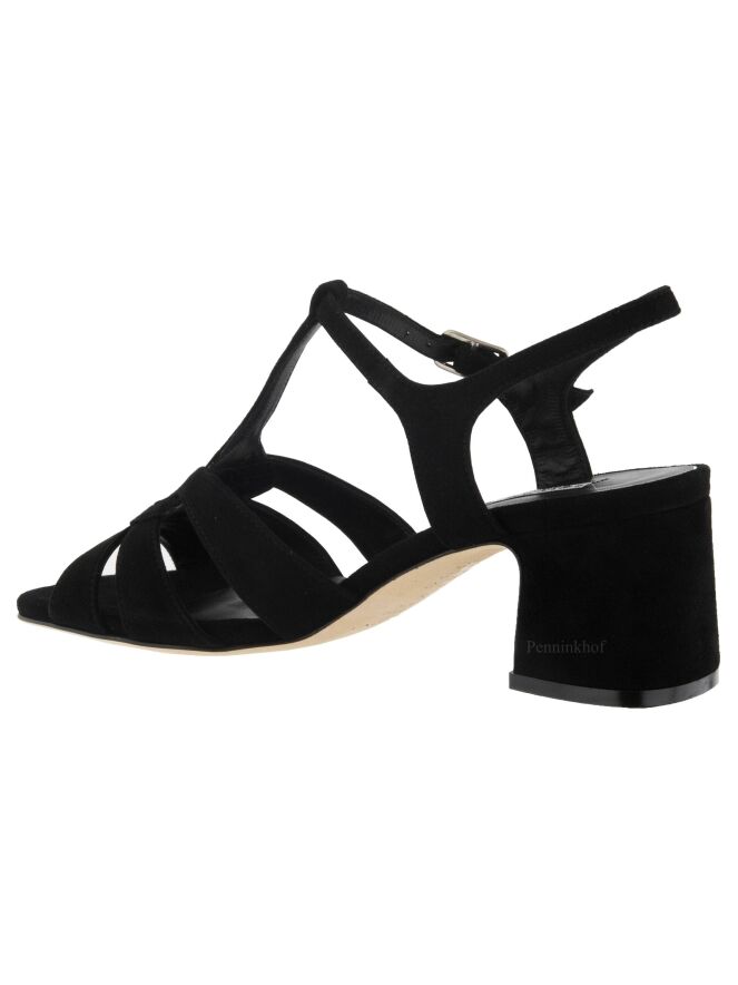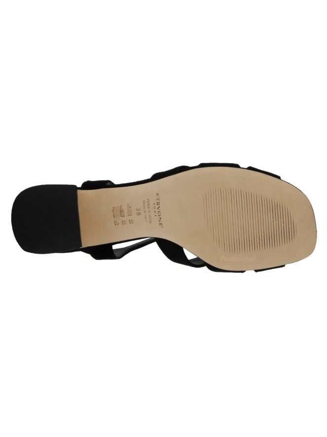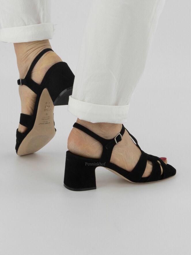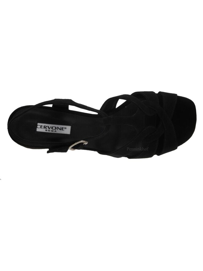 Ein offener Pumps der Schuhmarke Cervone in Schwarz. Der vordere Fußteil ist mit dem verstellbaren Knöchelriemen verbunden. Der Blockabsatz ist mit dem gleichen Material wie der gesamte Pumps bezogen.