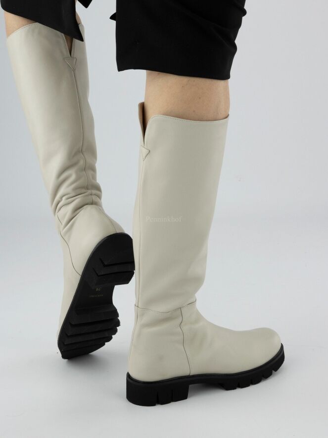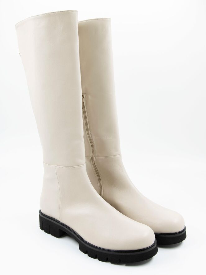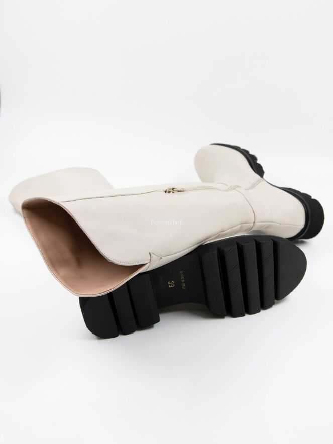 Ein hoher Stiefel von Cervone in Cremeweiß. Der Stiefel hat eine runde Nase und auf der Innenseite ist ein Reißverschluss bis zur Mitte der Wade. Der Stiefel ist auf der Innenseite mit Leder gefüttert.