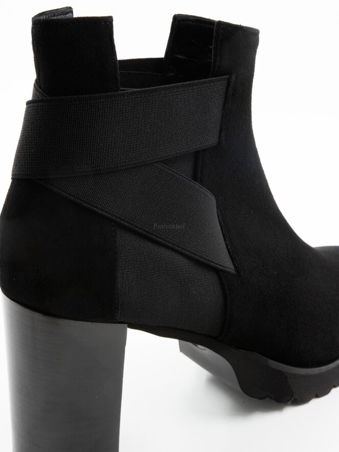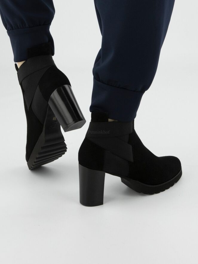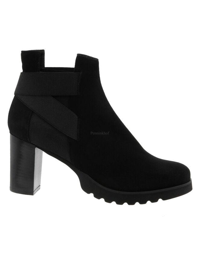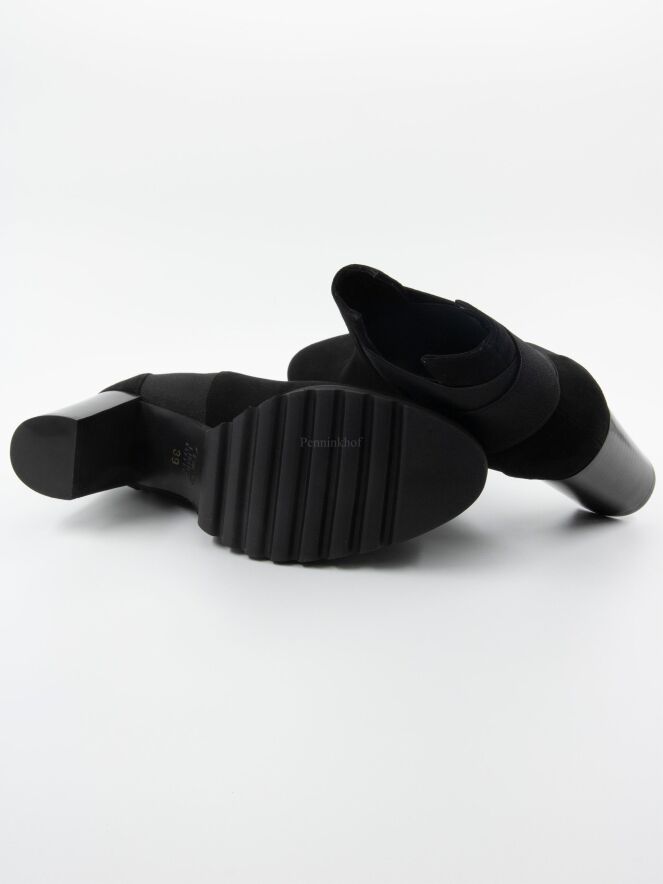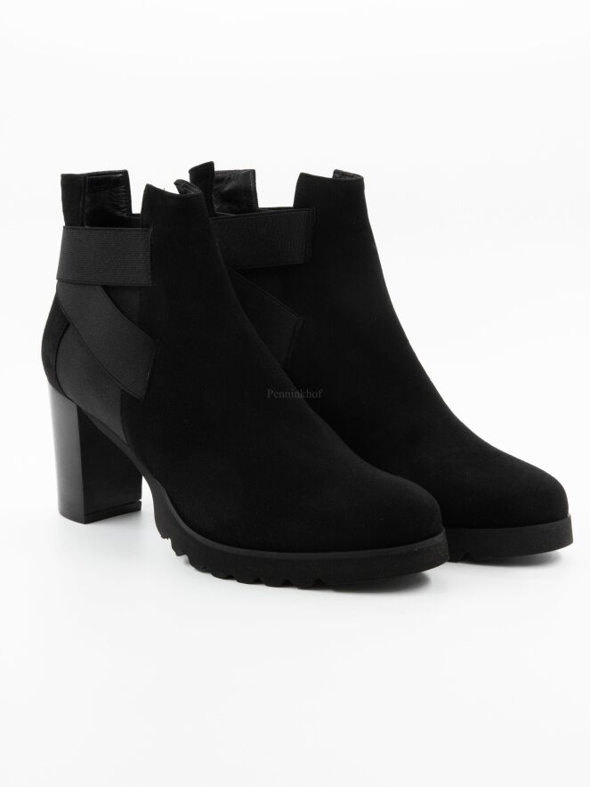 Eine kurze Stiefelette von Cervone in der Farbe schwarz. An beiden Seiten des Schafts befindet sich elastischer Stoff mit 2 zusätzlichen elastischen Riemen. Die niedrige Plateausohle ist gerippt. Die Innenseite ist mit Leder gefüttert.