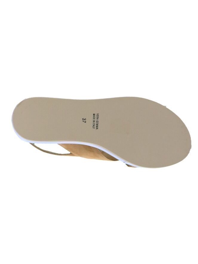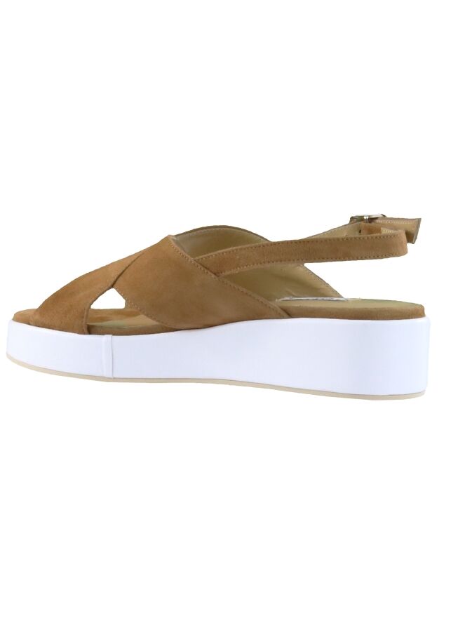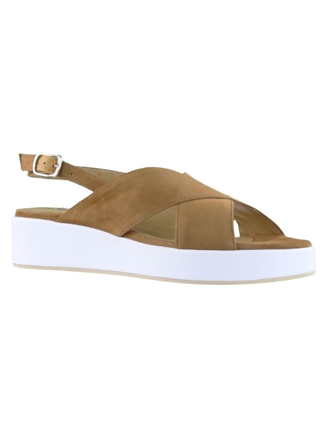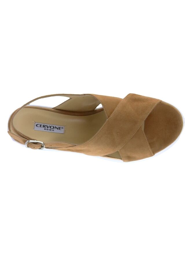 Eine edle Sandalette der Damenschuhmarke Cervone in Camel. Das Wildleder ist über den Vorfuß gekreuzt. Das Fersenriemchen ist einstellbar. Die Plateausohle ist weiß. Die Sandalette hat ein Innenfutter aus Leder.