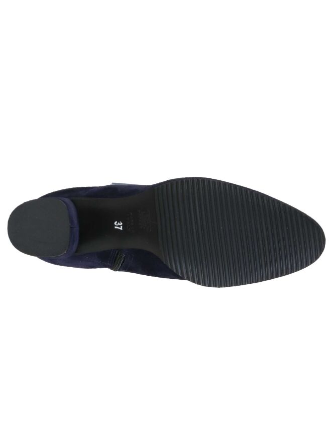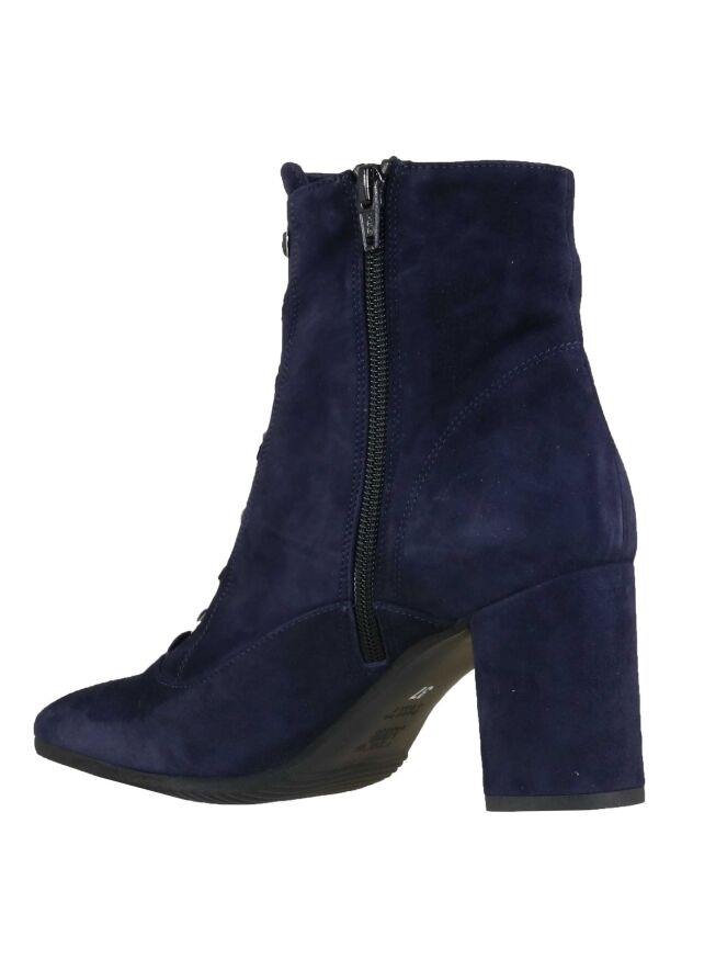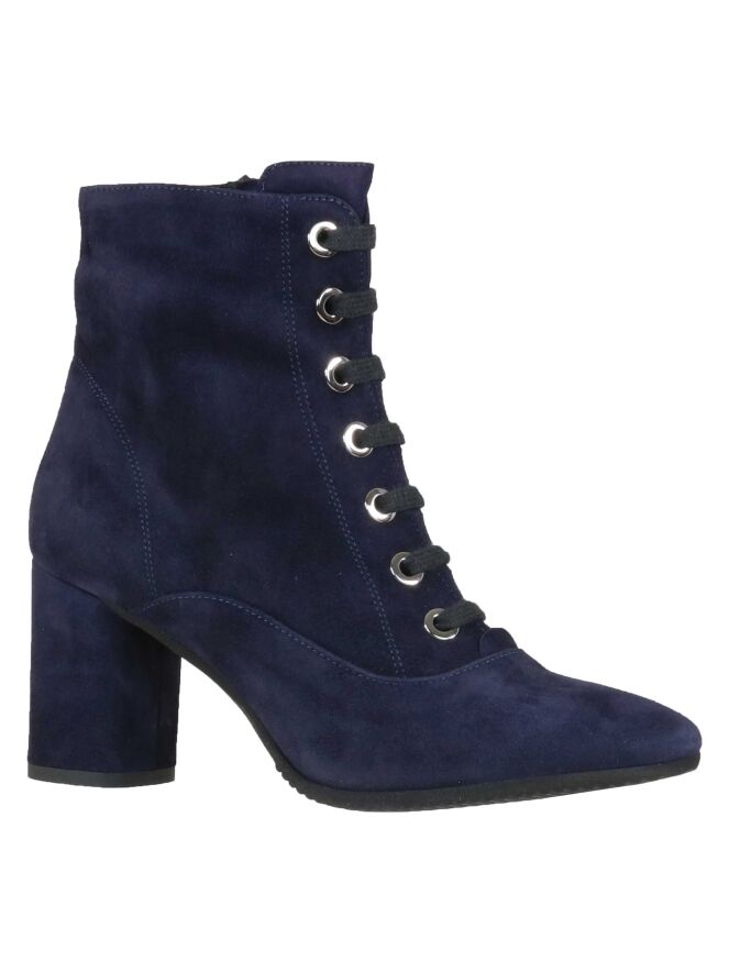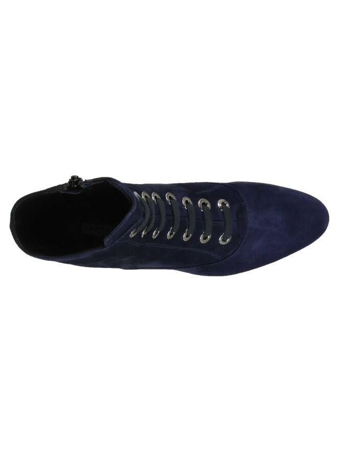 Indigoblaue Stiefelette der Designerschuhmarke Cervone. Die vorn schmal abgerundete Stiefelette in Old School-Optik hat einen robusten Blockabsatz, der mit demselben Obermaterial wie die Stiefelette versehen ist. Die Stiefelette kommt mit einer Zierschnürung mit silberfarbenen Ringen am Ansatz. Das Innenfutter ist aus Leder.