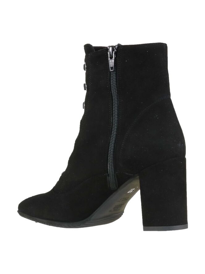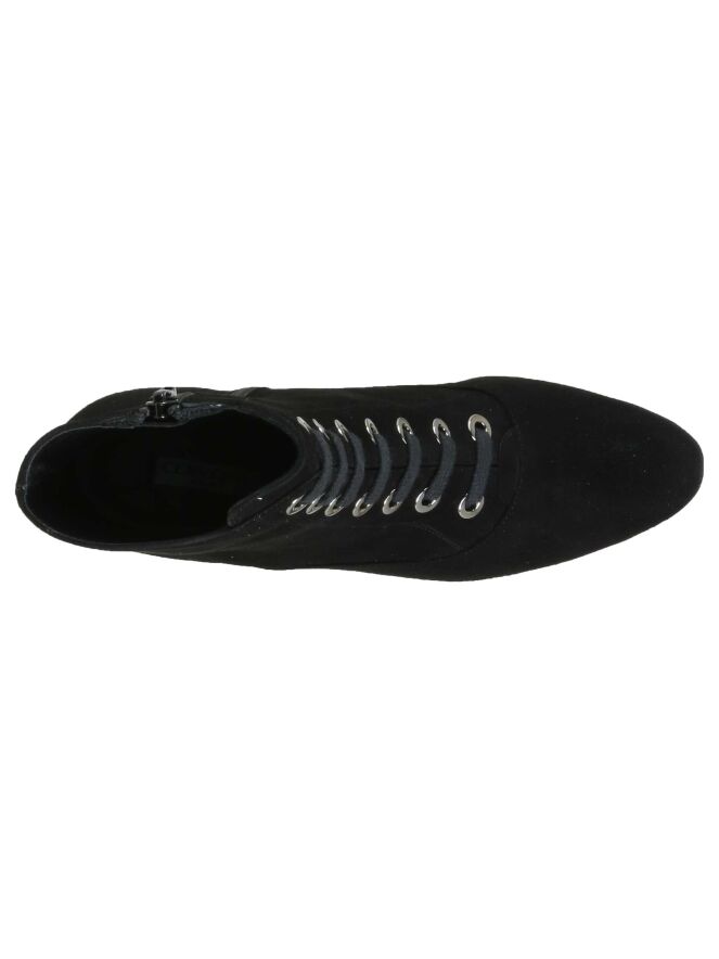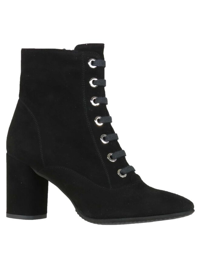 Schwarze Stiefelette der Designerschuhmarke Cervone. Die vorn schmal abgerundete Stiefelette in Old School-Optik hat einen robusten Blockabsatz, der mit demselben Obermaterial wie die Stiefelette versehen ist. Die Stiefelette kommt mit einer Zierschnürung mit silberfarbenen Ringen am Ansatz. Das Innenfutter ist aus Leder.