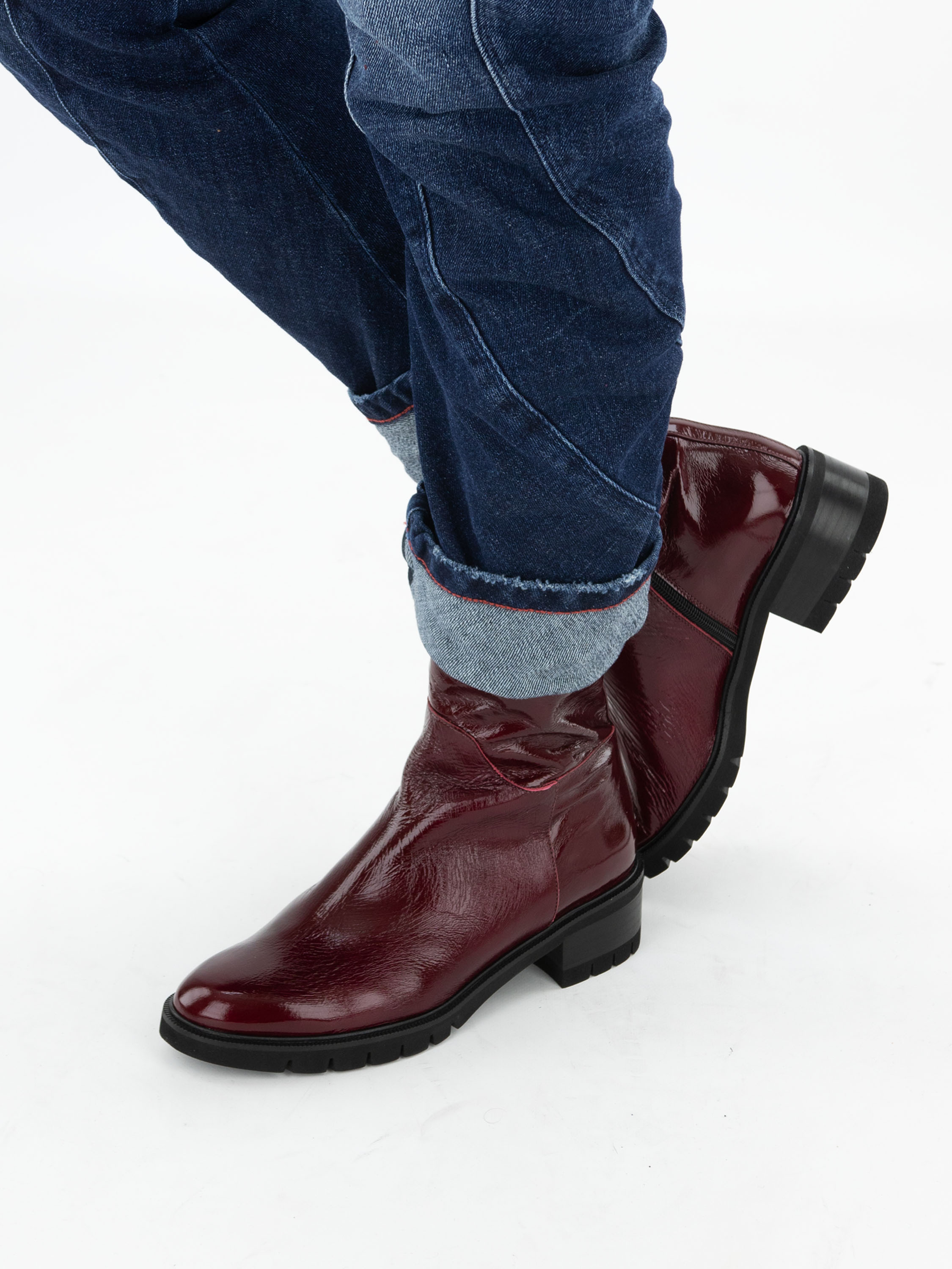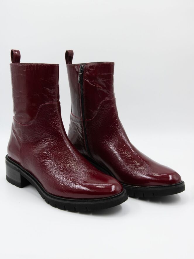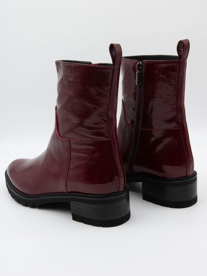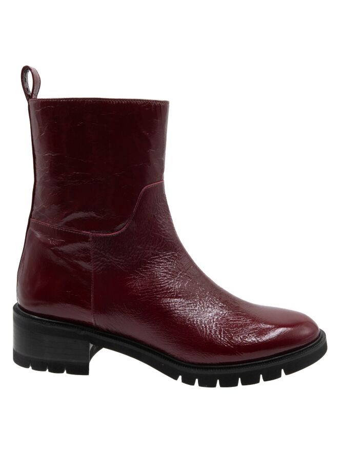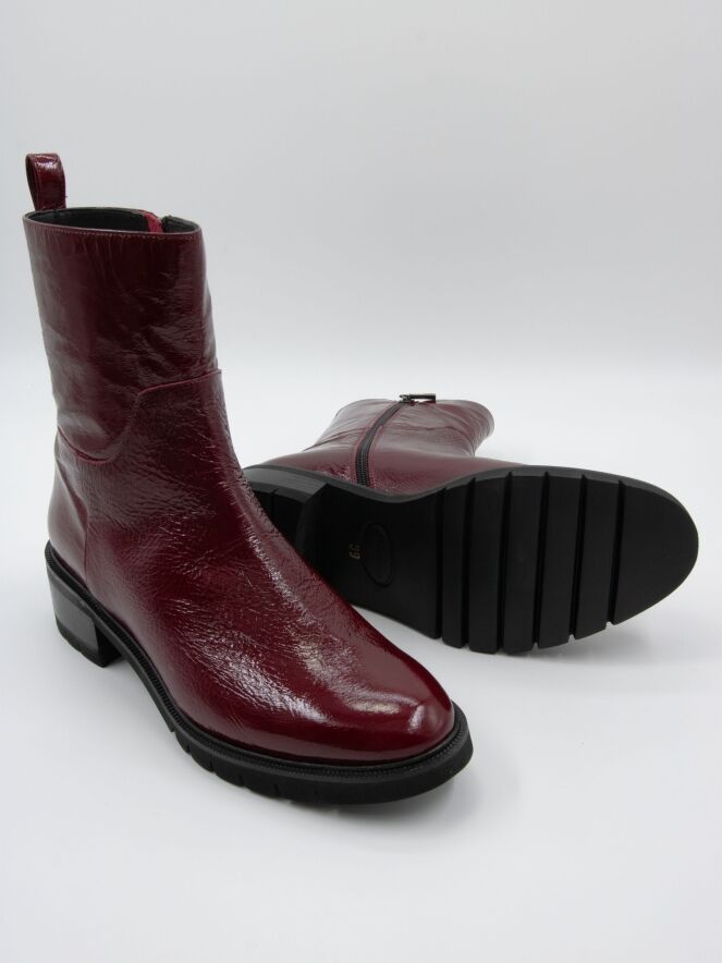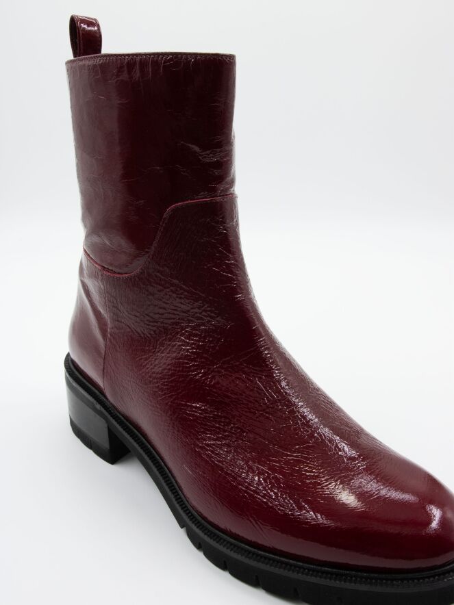 Ein Stiefelette von Cervone in einer Qualität aus Knitterlack in bordeauxroter Farbe. Entlang des Randes der Sohle befindet sich eine schmale Paspel. Der Absatz ist teilweise holzfarben und teilweise schwarz. An der Innenseite befindet sich ein Reißverschluss und das Innere ist mit Leder gefüttert.