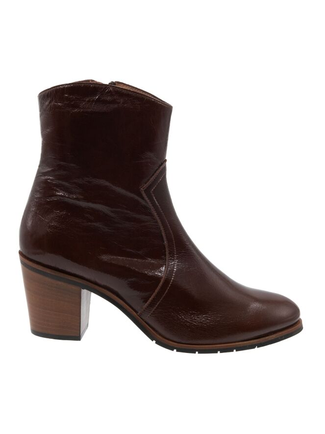 Ein kurzer Westernstiefel von Cervone in einer Knitterlackqualität in dunklem Cognac. Der Stiefel hat eine schlanke Spitze und einen Reißverschluss an der Innenseite. Das Innere des Stiefels ist mit Leder gefüttert.