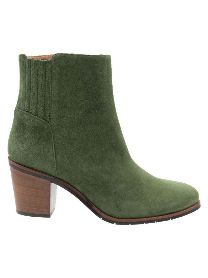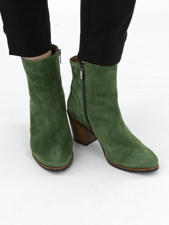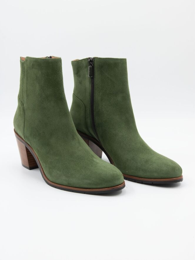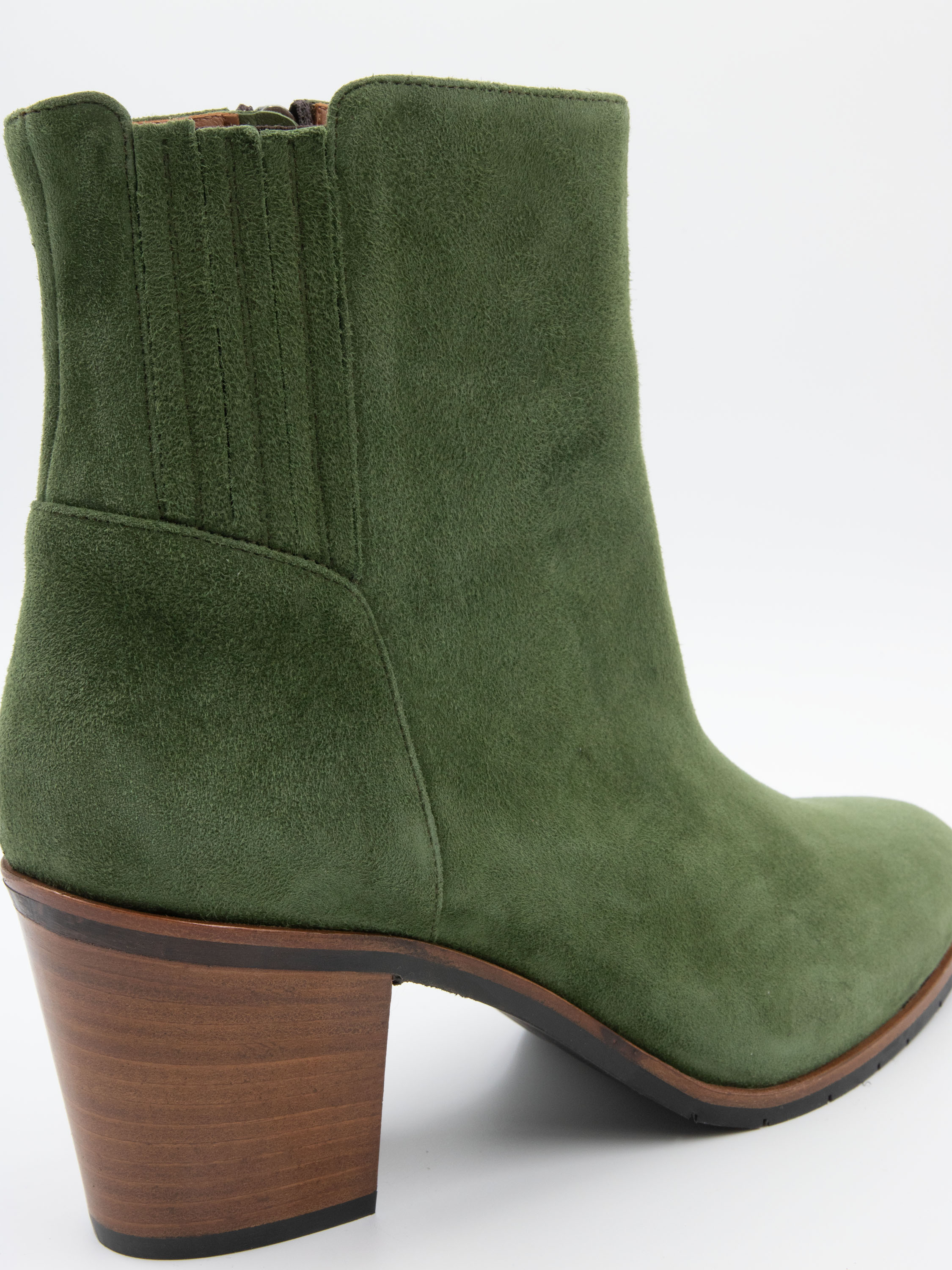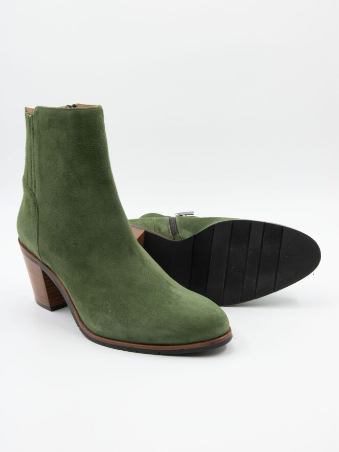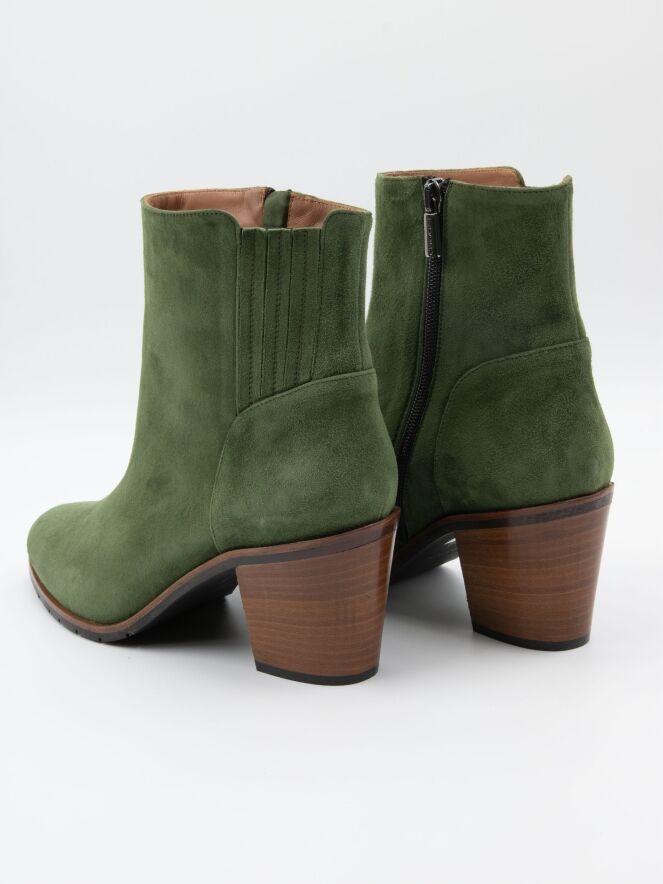 Ein kurzer Westernstiefel von Cervone in olivgrüner Farbe. Der Stiefel hat eine schlanke Spitze und einen Reißverschluss an der Innenseite. An der Rückseite des Schafts ist das Leder mit einem Gummiband dahinter geschnitten. Das Innere ist mit Leder gefüttert.