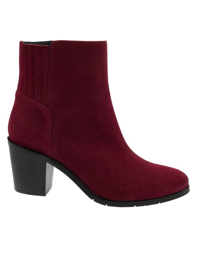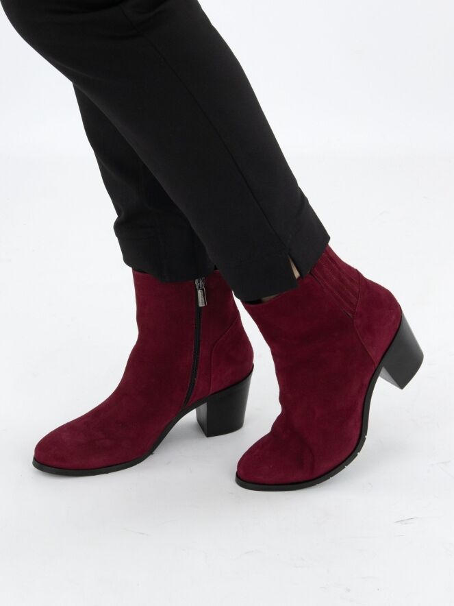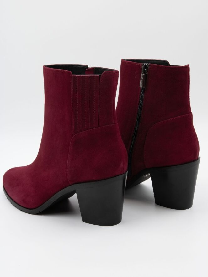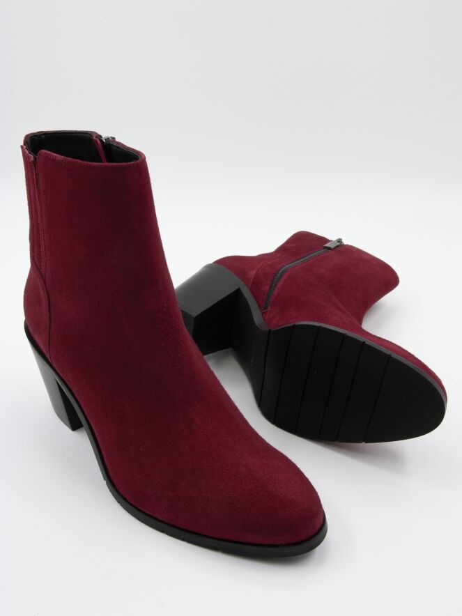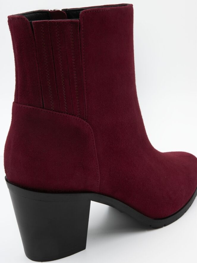 Ein kurzer Westernstiefel von Cervone in bordeauxroter Farbe. Der Stiefel hat eine schlanke Spitze und einen Reißverschluss an der Innenseite. Am hinteren Schaft ist das Leder geschnitten mit einem elastischen Band dahinter. Das Innere ist mit Leder gefüttert.
