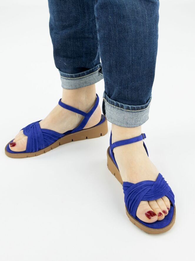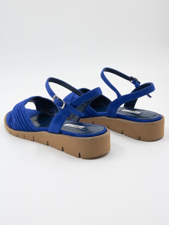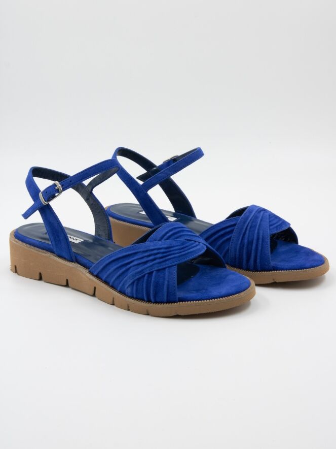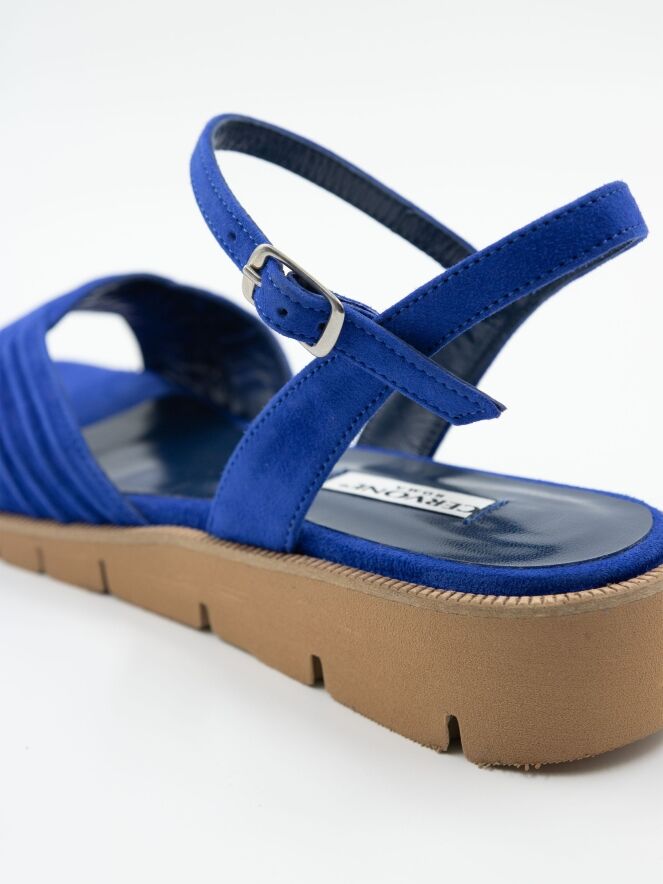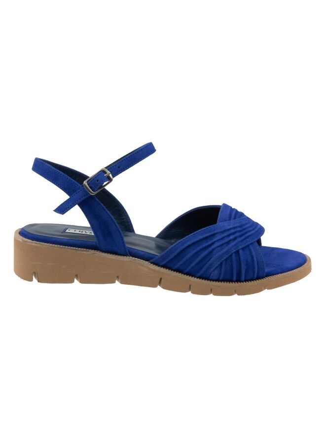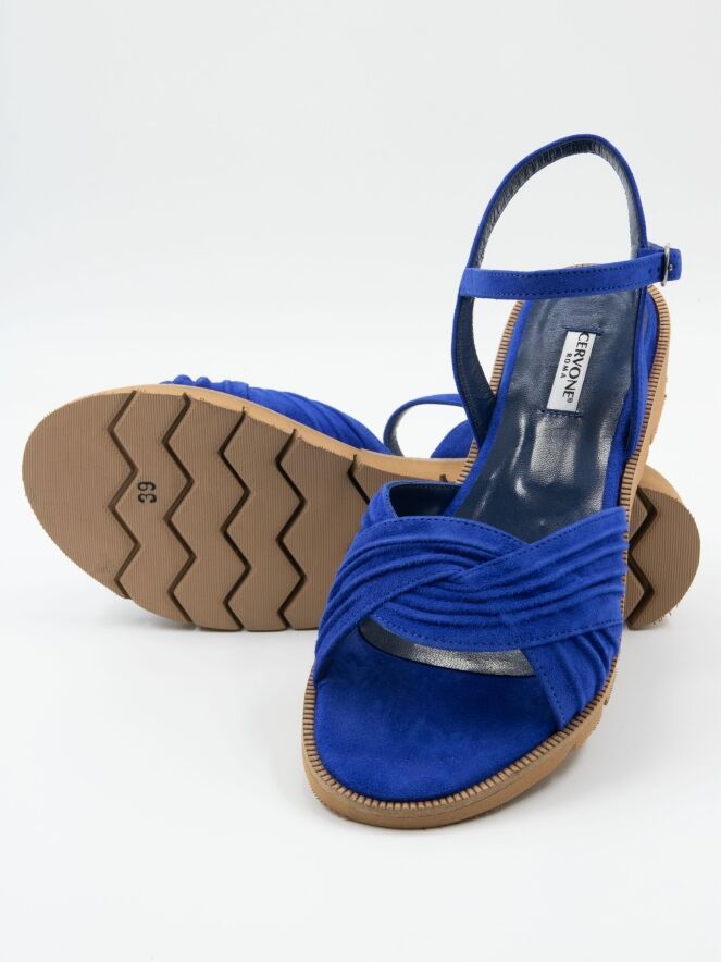 Ein Sandale von Cervone in einer kobaltblauen Farbe. Die beiden gerippten Wildlederbänder über dem Vorfuß sind gekreuzt. Der Knöchelriemen ist verstellbar. Die Sohle ist in einer sandfarbenen Farbe.