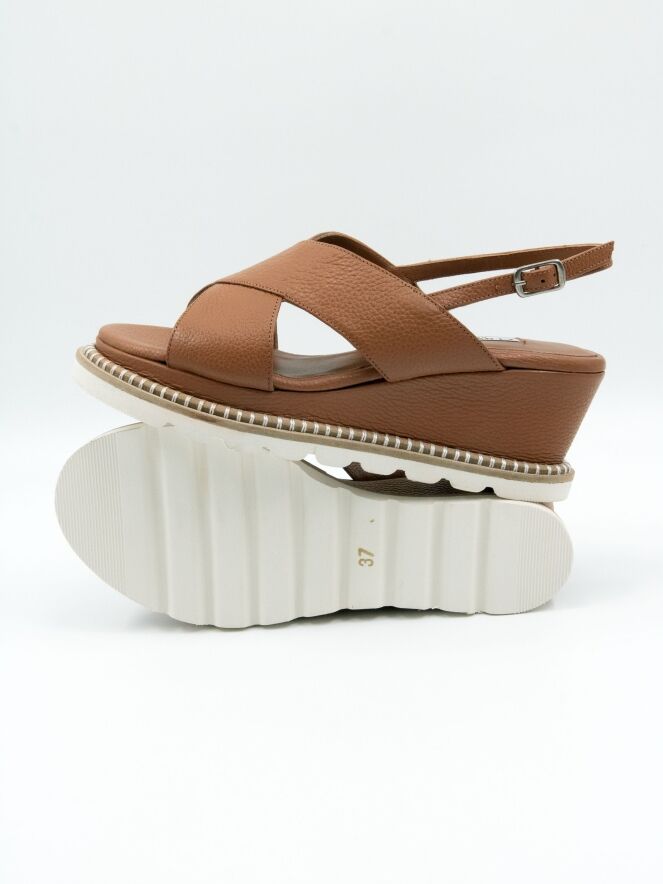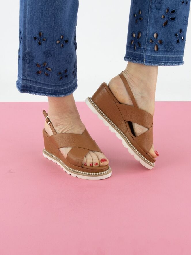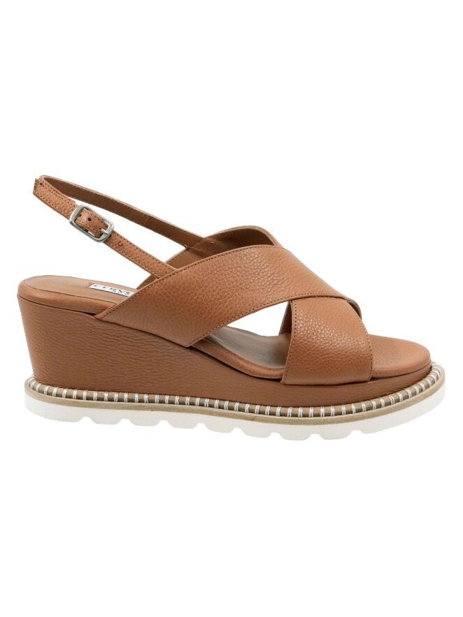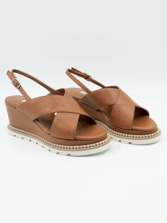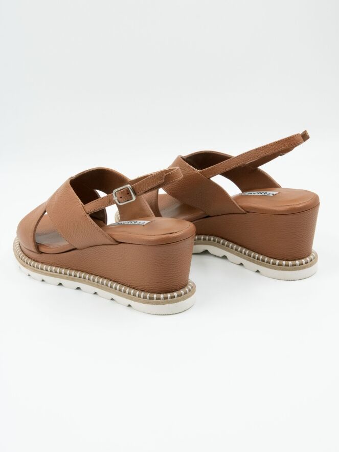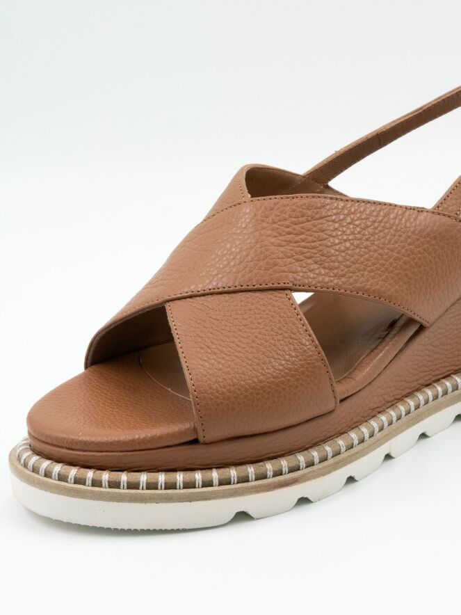 Eine Sandale von Cervone in Cognac. Die Sandale hat gekreuzte Riemen über dem Vorderfuß und ein verstellbares Fersenriemchen. Entlang des Randes der weißen Sohle verläuft eine runde Jutekante in Sandfarbe, verziert mit dekorativen weißen Nähten, die darum gewickelt sind.
