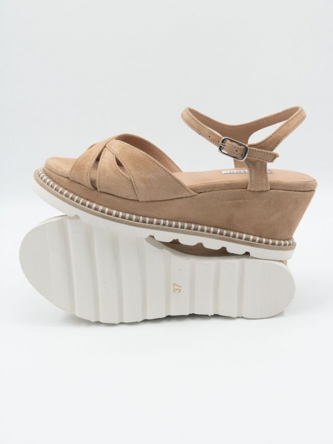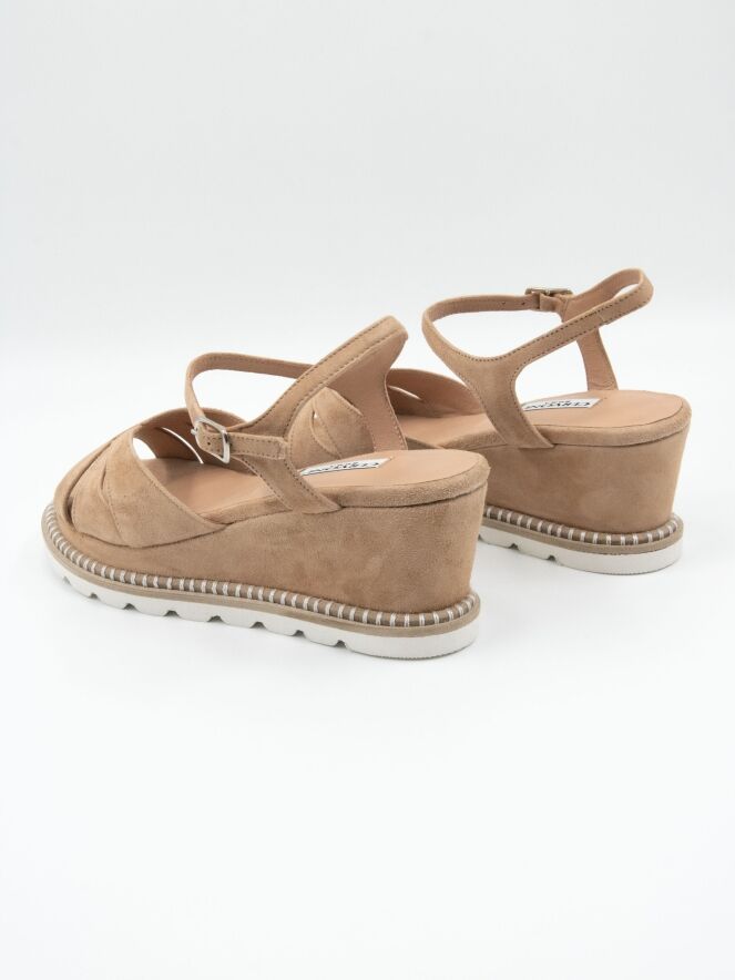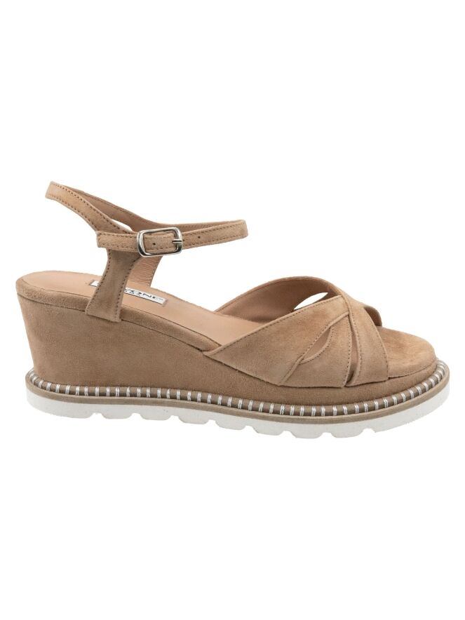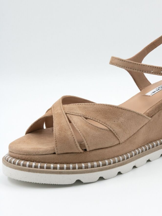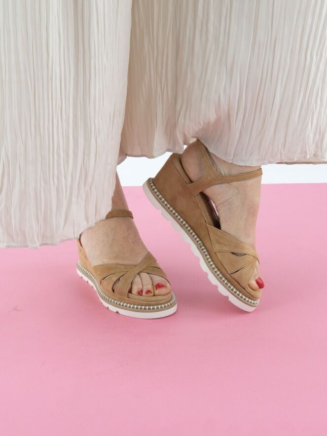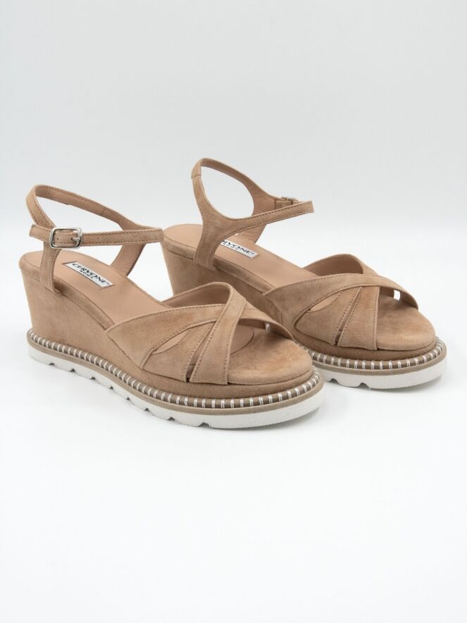 Eine Keilsandale von Cervone in einem weichen Kamelton. Die Sandale hat gekreuzte Riemchen über dem Vorderfuß und ein verstellbares Knöchelriemchen. Entlang des Randes der weißen Sohle verläuft eine runde Jutekante in Sandfarbe, mit dekorativen weißen Ziernähten, die darum gewickelt sind.