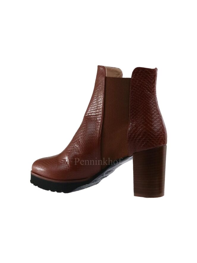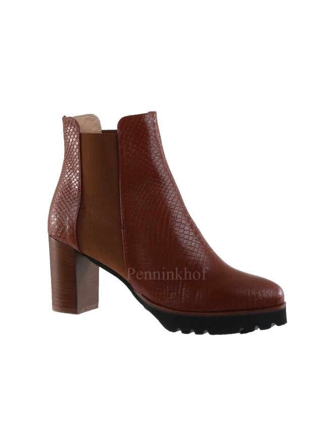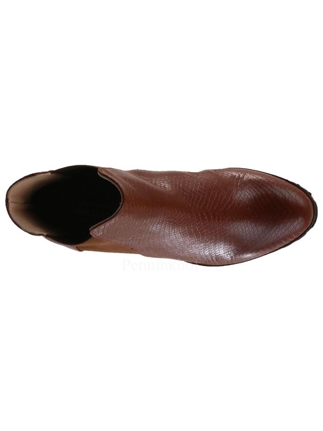 Eine cognacfarbene Stiefelette der Schuhmarke Cervone in Reptilstruktur. Auf beiden Seiten des Schafts befindet sich ein elastischer Einsatz. Die gezackte Sohle ist schwarz. Das Innenfutter ist aus Leder.