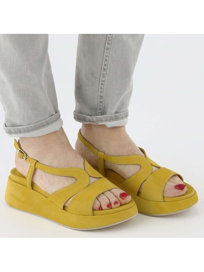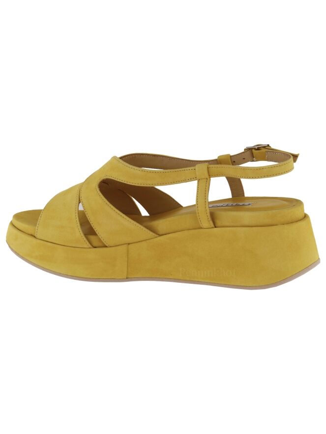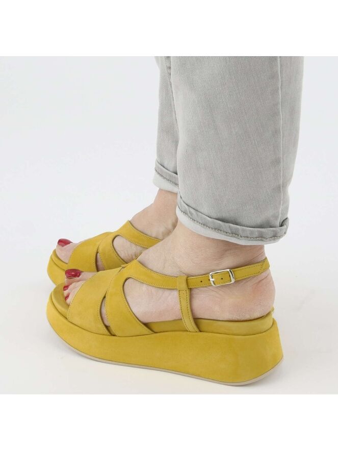 Eine offene Sandalette der Damenschuhmarke Cervone in Gelb. Die Sandale hat eine offene Zehe. Das breite Band auf dem Spann ist aus Veloursleder. Der Fersenriemen ist verstellbar. Die Plateausohle ist mit dem gleichen Material wie die Sandale bezogen.