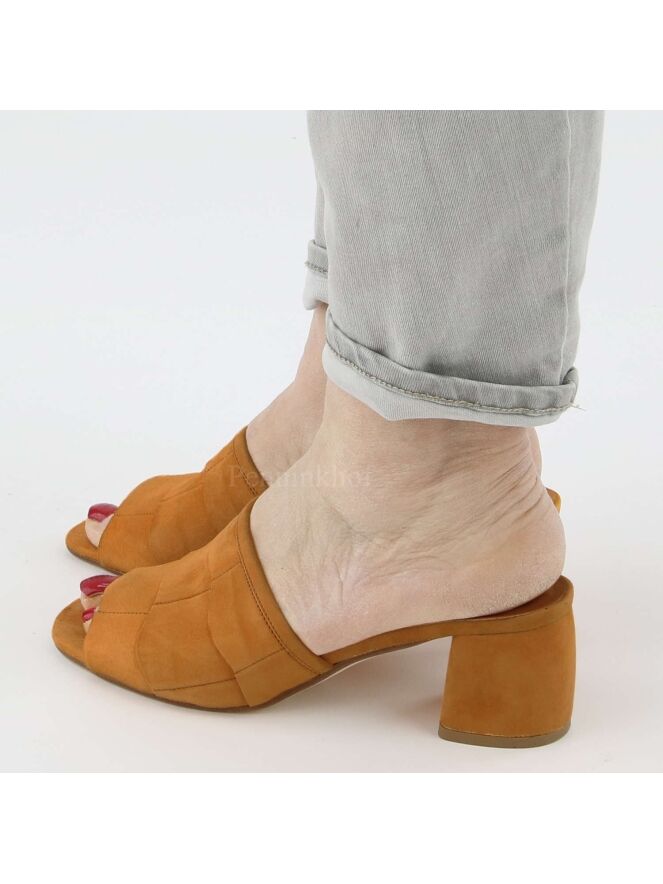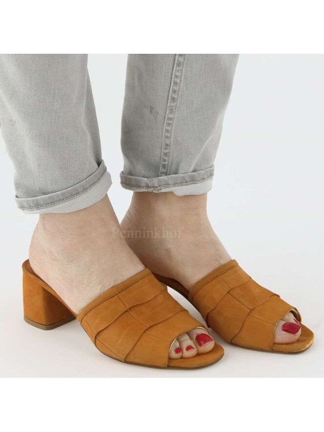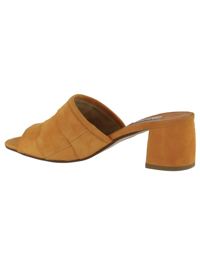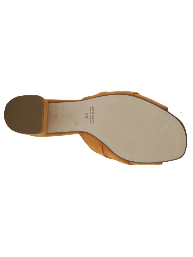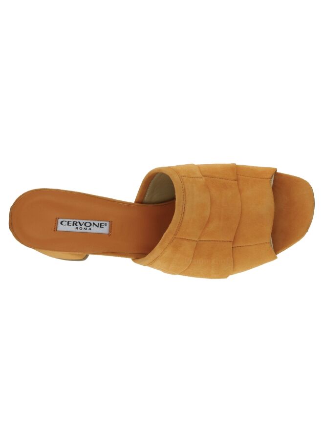 Eine Sandalette der Schuhmarke Cervone in Orange. Die Sandalette ist vorne offen. Auf dem Spann ist das Wildleder schuppenförmig vernäht. Der Absatz ist mit Wildleder in der gleichen Farbe wie die Sandalette überzogen.
