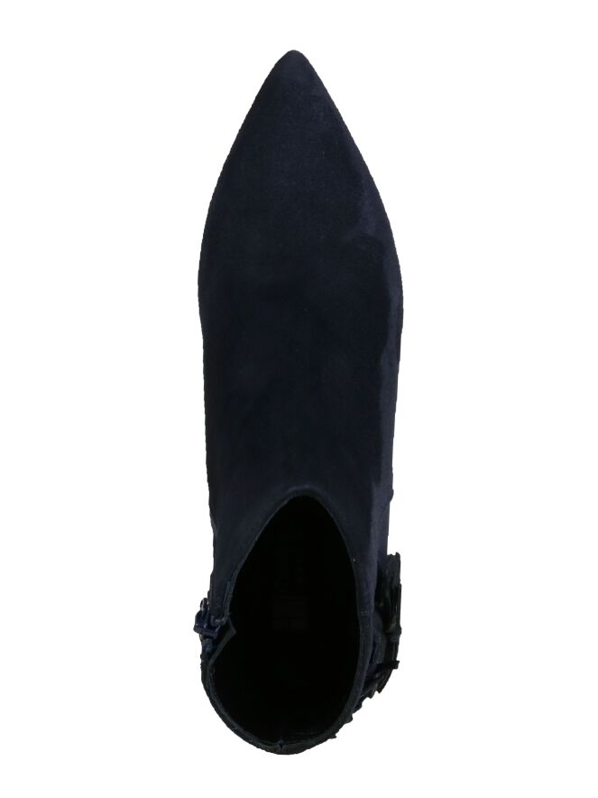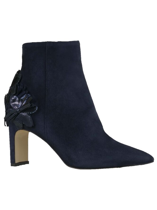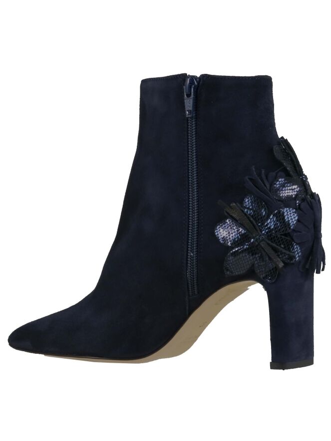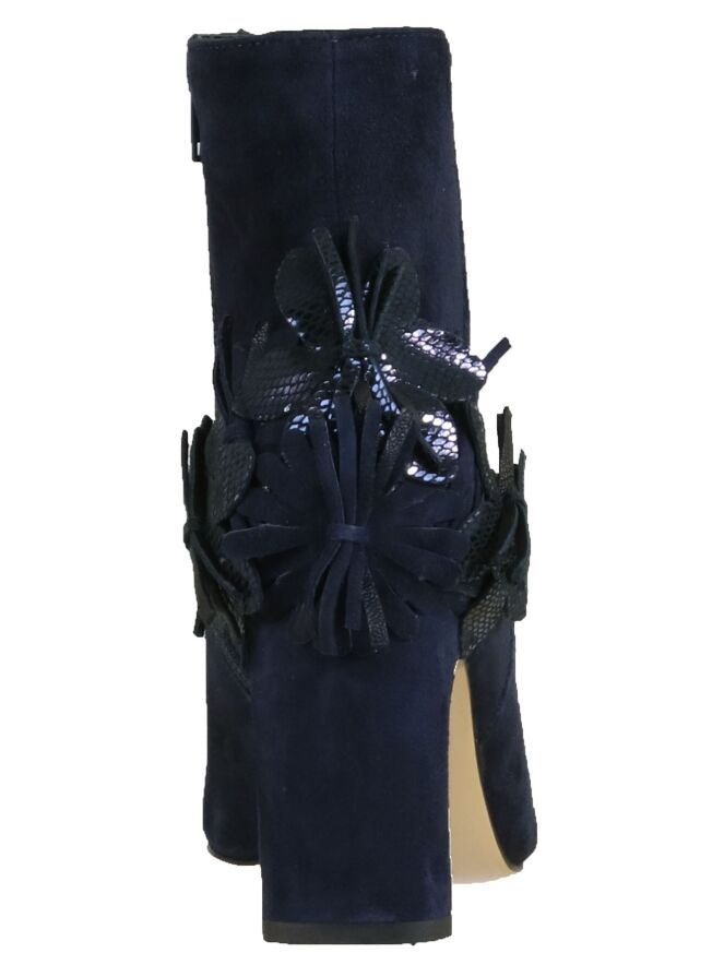 Nachtblaue Stiefelette der Designerschuhmarke Christian Daniel. Die spitz zulaufende Stiefelette ist an der Ferse mit Blumen und Lederfransen mit Waffelmuster verziert. Der elegante Absatz ist mit Wildleder bestückt. Die Stiefelette hat ein Innenfutter aus Leder.