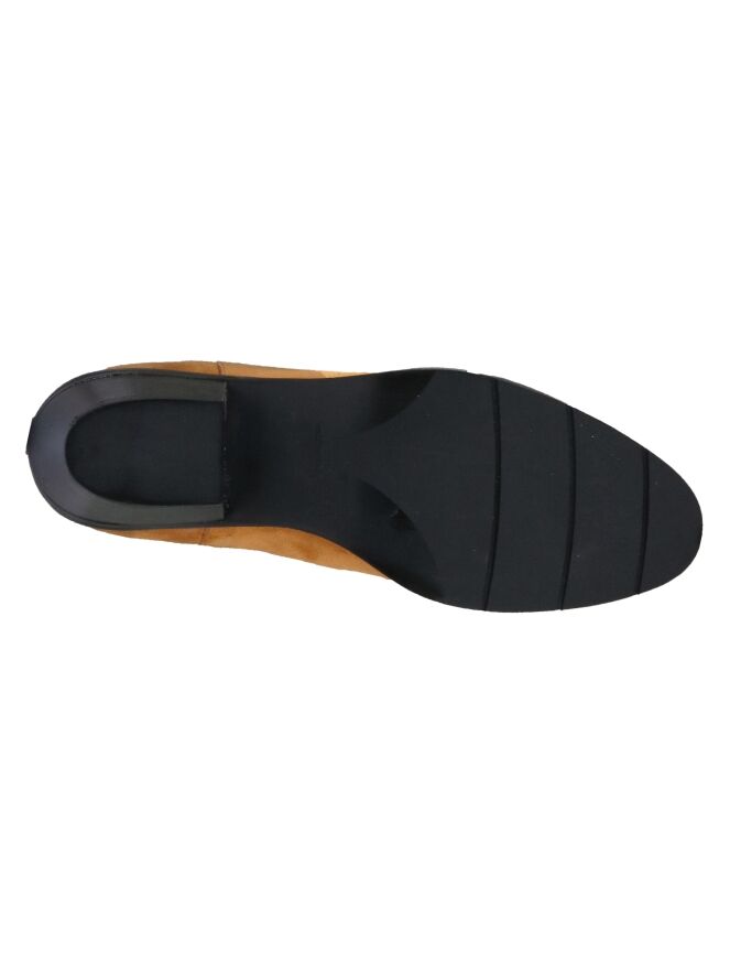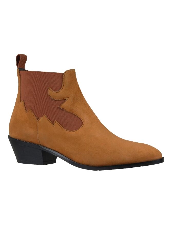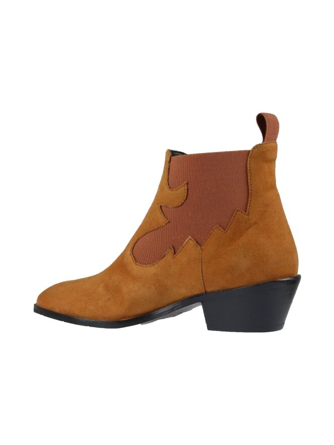 Cognacfarbene Westernstiefelette der Designerschuhmarke Christian Daniel. Beide Seiten sind mit einem braunen elastischen Stoffeinsatz im Westernlook versehen. Die vorne abgerundete Stiefelette hat einen schwarzen Absatz. Die Stiefelette hat ein Innenfutter aus Leder.