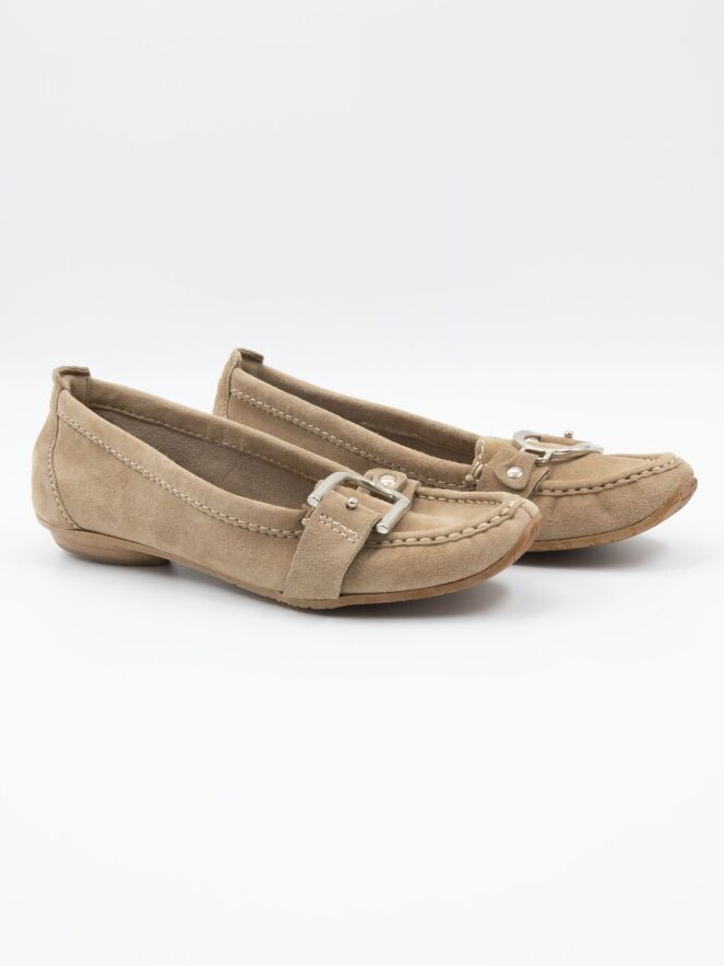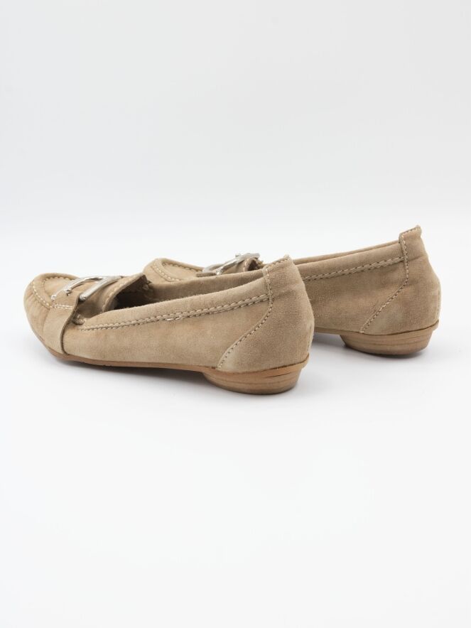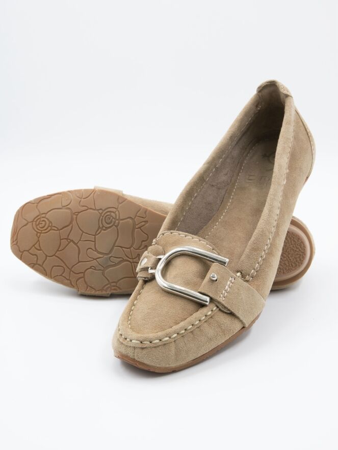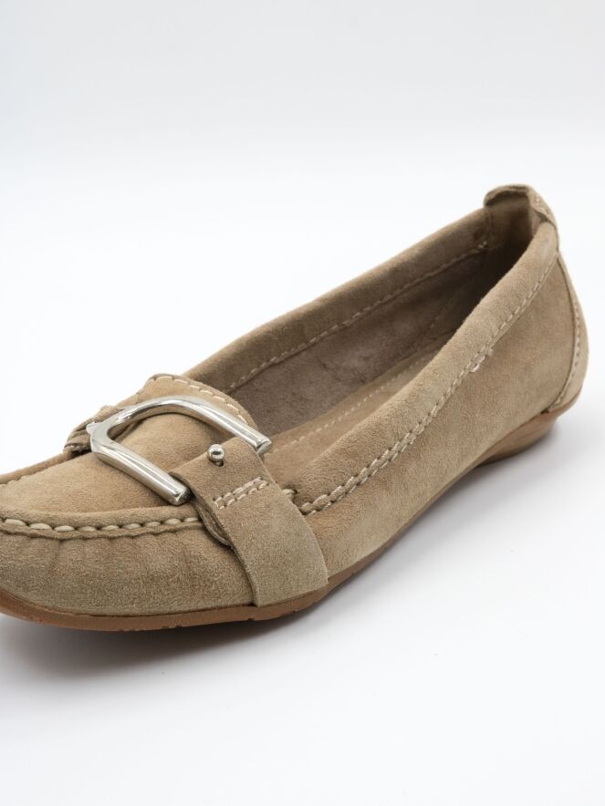 Ein Mokassin von DMN in Sandfarbe. Über den Vorderfuß verläuft ein Band mit einer silberfarbenen Schnalle. Das Innere ist ungefüttert.
