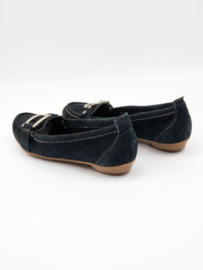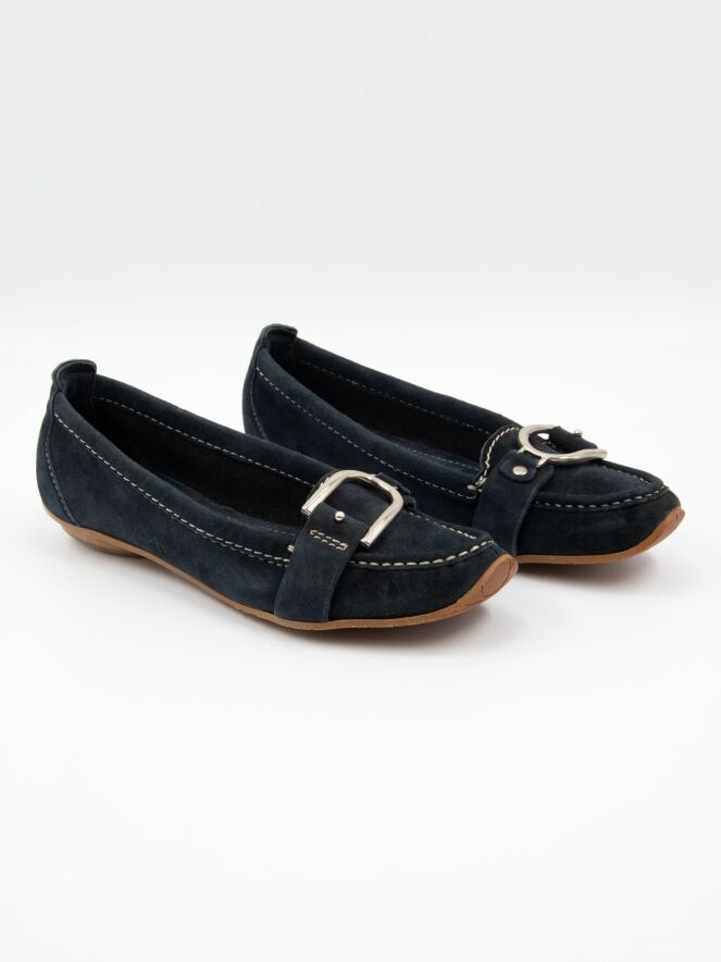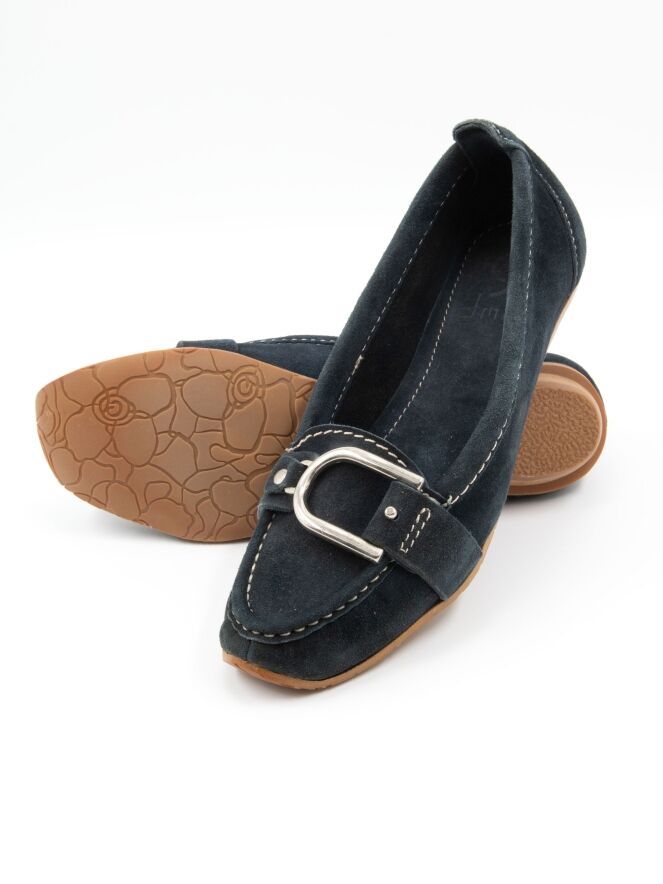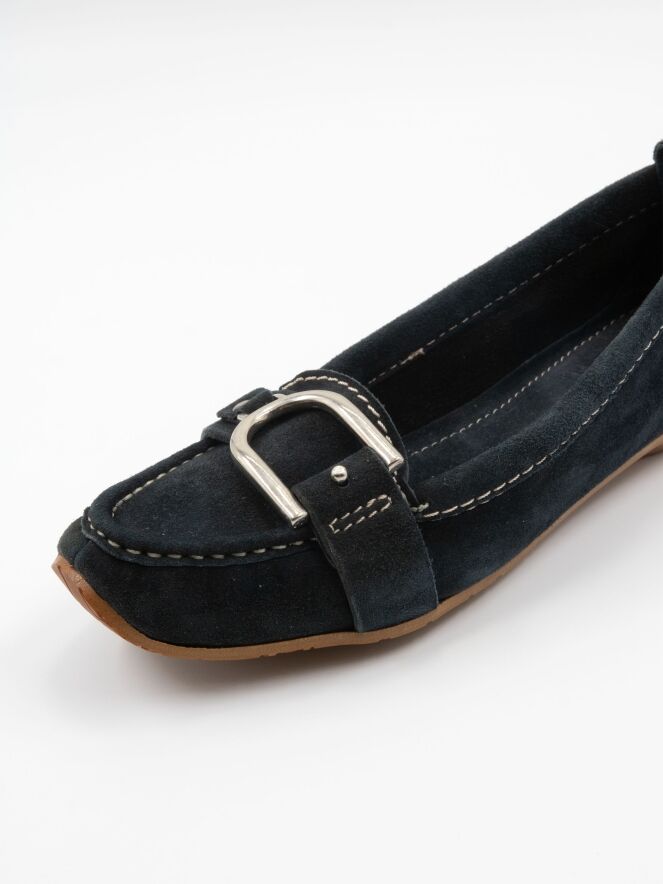 Ein Mokassin von DMN in Blau. Über den Vorderfuß verläuft ein Band mit einer silberfarbenen Schnalle. Das Innere ist ungefüttert.