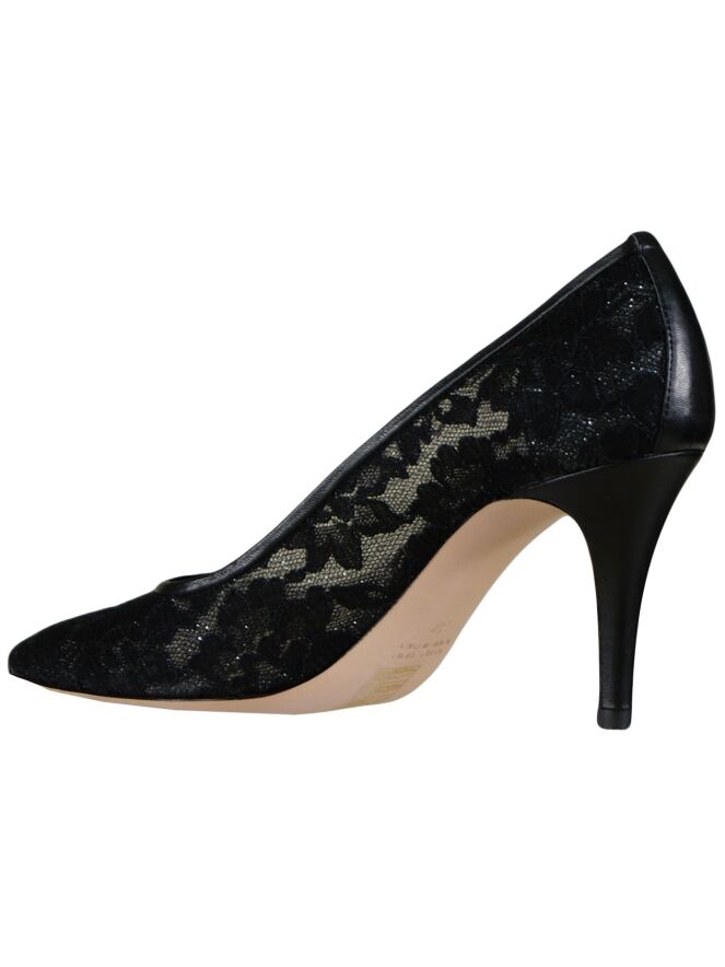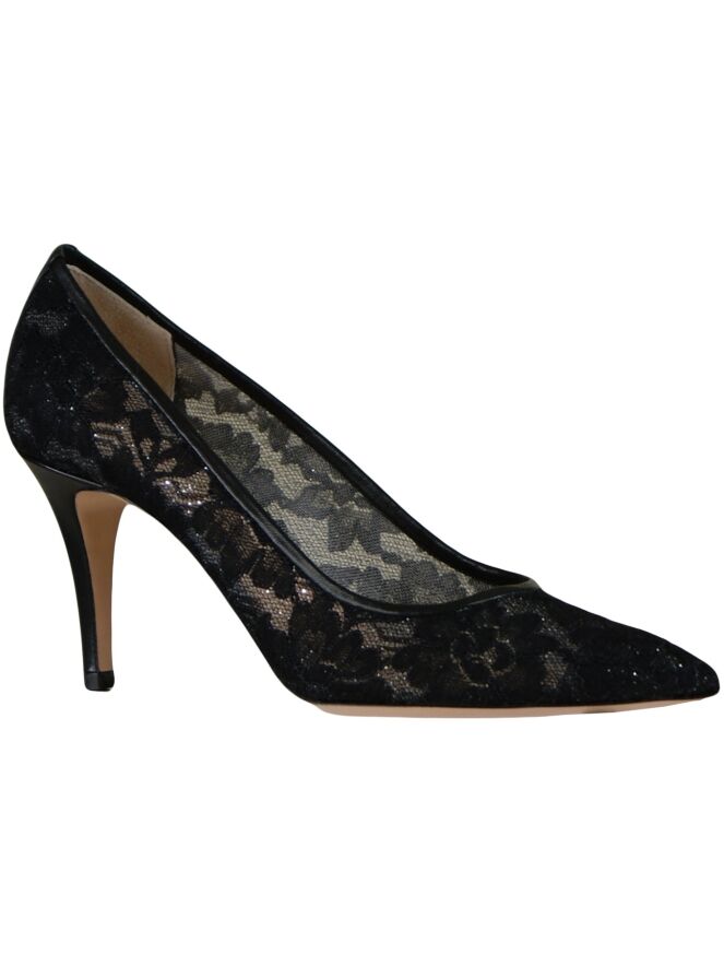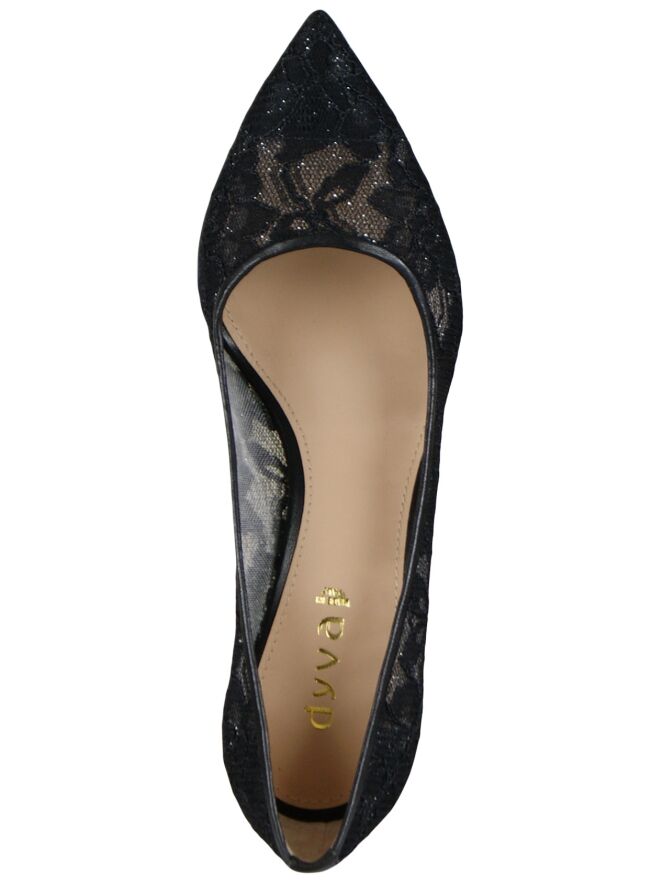 Schwarzer Pumps der Designerschuhmarke Dyva aus Spitze mit einem verwobenen Silberfaden und einer schmal zulaufenden Schuhspitze. Der Pumps hat ein Innenfutter aus Leder.
