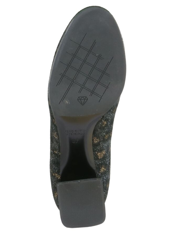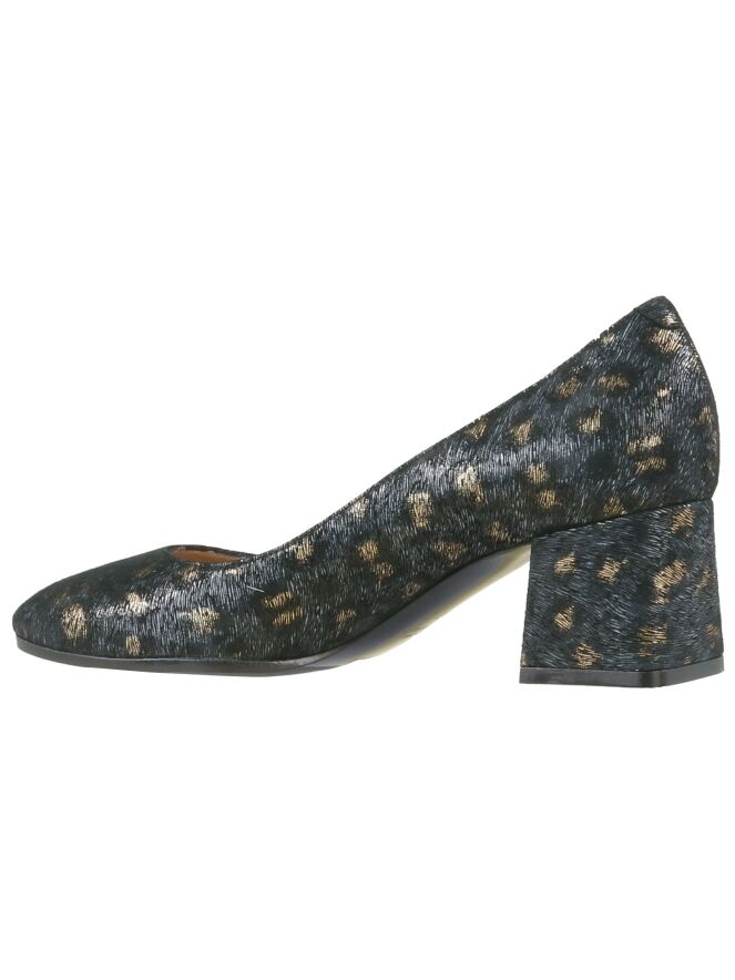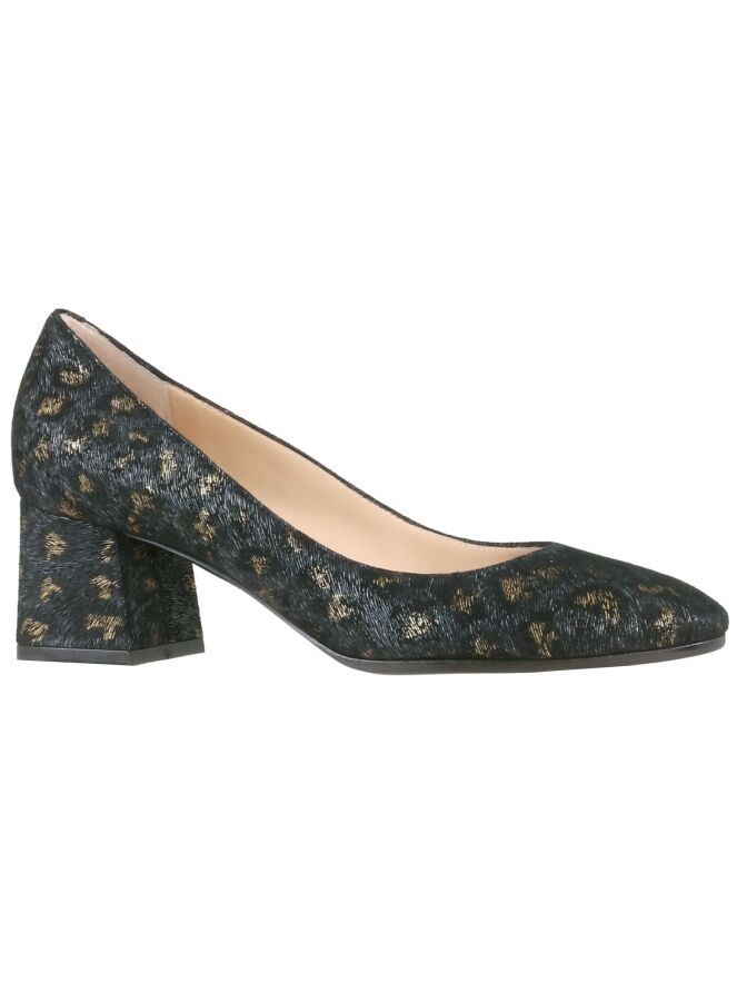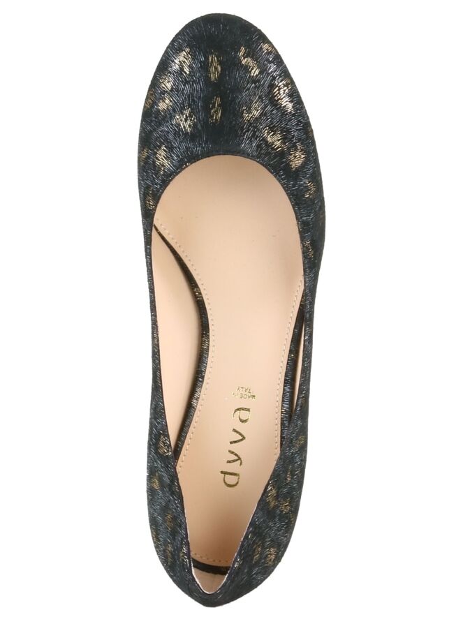 Pumps der Designerschuhmarke Dyva mit Print in den Farben Marineblau, Gold und Schwarz. Der Pumps ist vorn abgerundet, und der Blockabsatz ist mit demselben Material wie der Schuh bestückt. Der Pumps hat ein Innenfutter aus Leder.