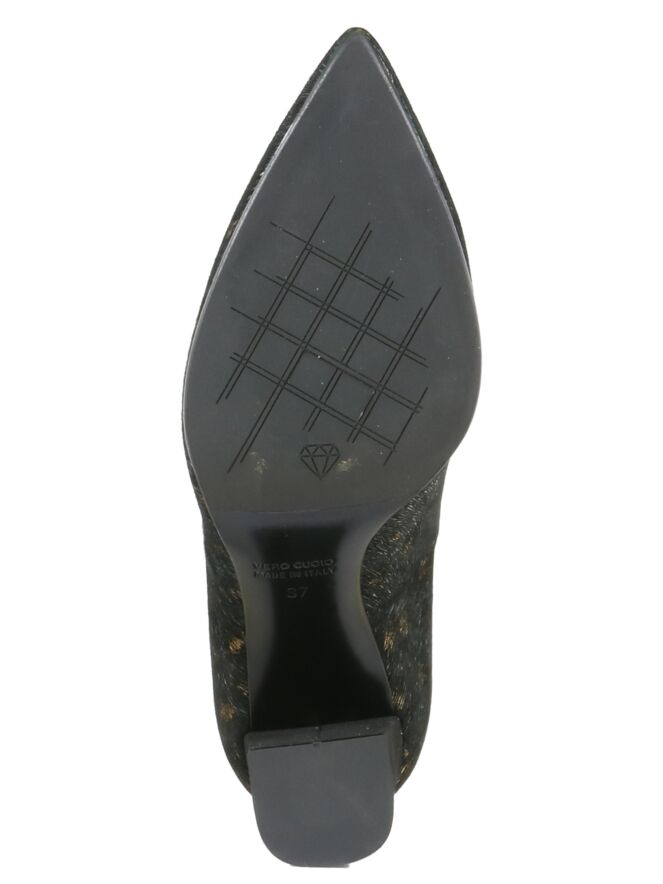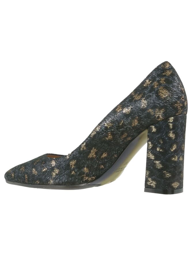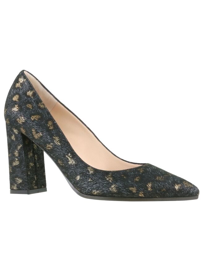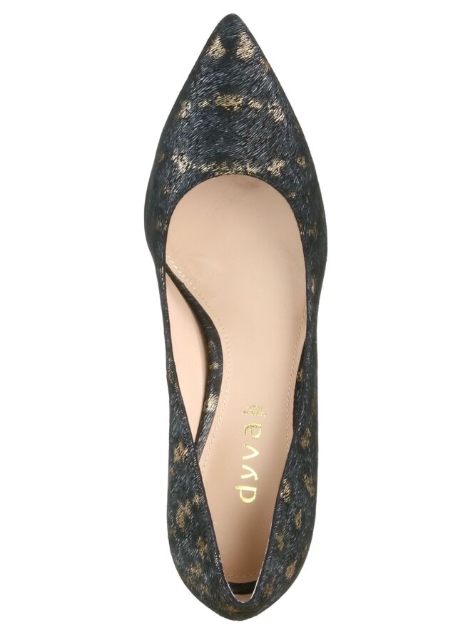 Pumps der Designerschuhmarke Dyva mit Print in den Farben Gold und Schwarz. Die Schuhspitze des Pumps ist schmal, und der Blockabsatz ist mit demselben Material wie der Schuh bestückt. Der Pumps hat ein Innenfutter aus Leder.