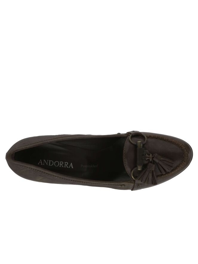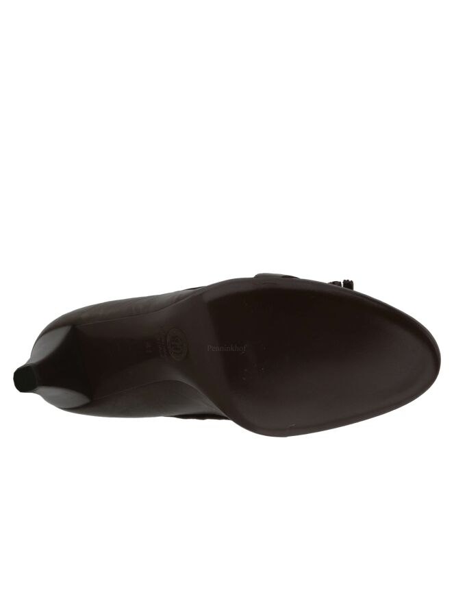 Ein Pump von Dyva in Mokkabraun. Entlang des Randes der Vorfußpartie befindet sich eine umgekehrte Naht. Auf dem Vorfuß ist ein kleines Metallstück mit zwei Quasten. Der schlank zulaufende Absatz ist in einer neutralen dunkelbraunen Farbe. Das Innere ist mit Leder gefüttert.