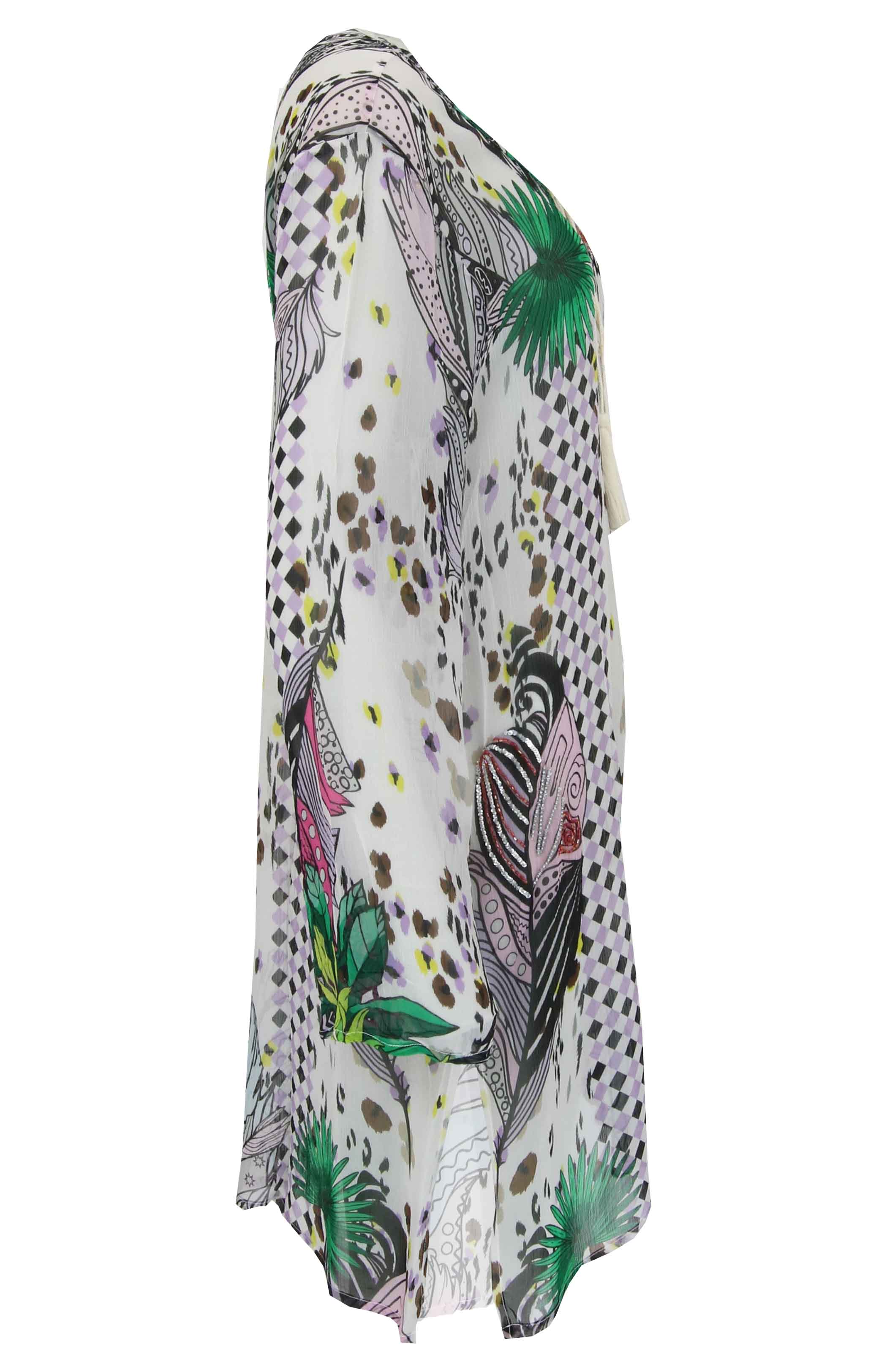 Cremeweiße, durchsichtige Tunika der Designermarke Etoile du Monde mit Aufdruck in Schwarz, Grün und Lila. Die Vorderseite ist an verschiedenen Stellen mit Pailletten verziert. Die Langarm-Tunika hat einen runden Halsausschnitt und darf kalt von Hand gewaschen werden.