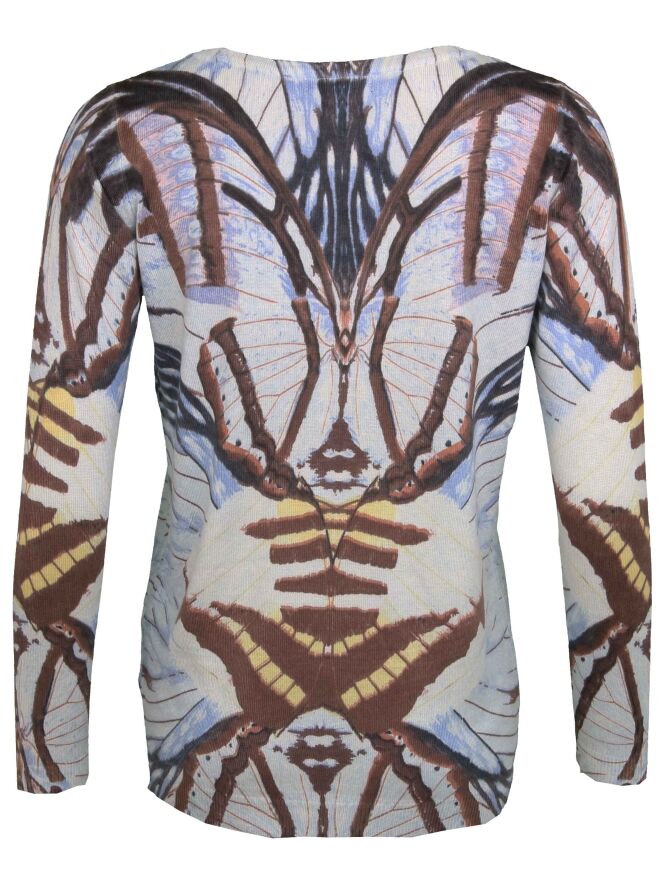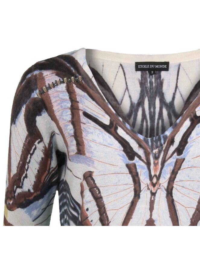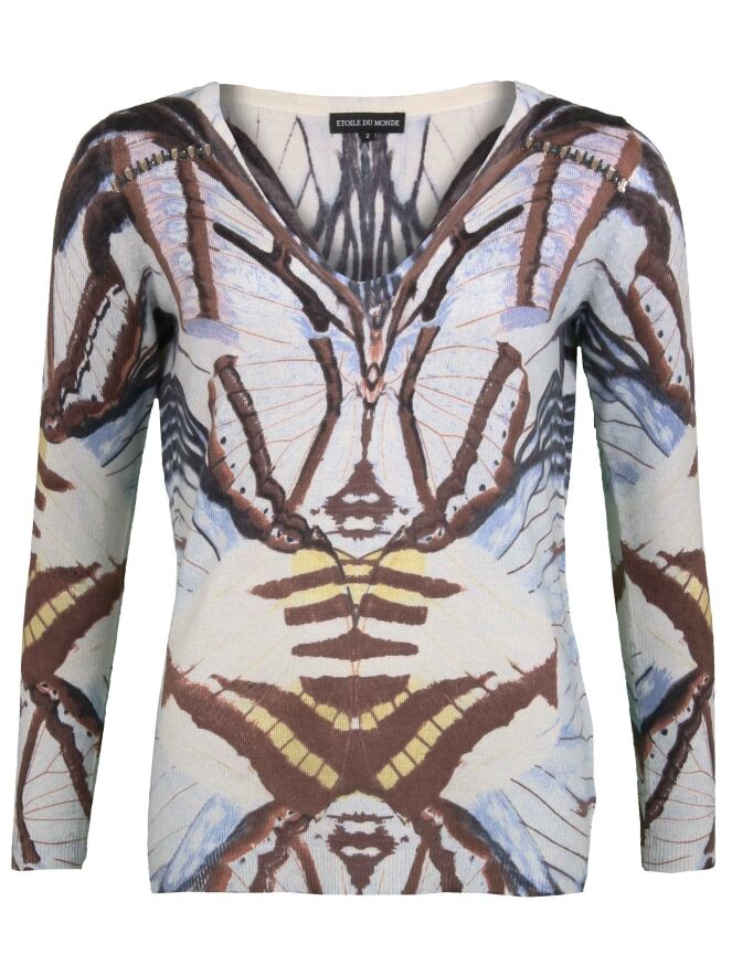 Pullover der Designermarke Etoile du Monde mit Grafikmuster in Braun, Schwarz und Eisblau auf einem cremeweißen Hintergrund. Die Schulterpartie wird durch dekorative Straßsteinchen akzentuiert. Der Pullover hat einen V-Ausschnitt und kann auf 30 Grad in der Waschmaschine gewaschen werden.