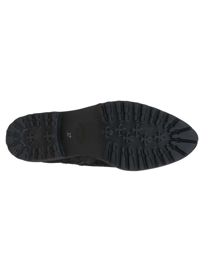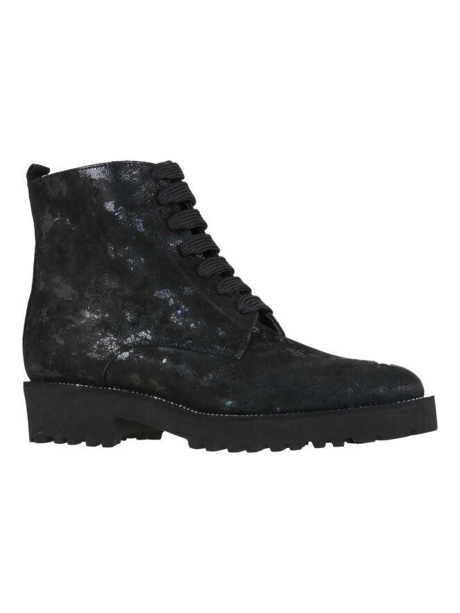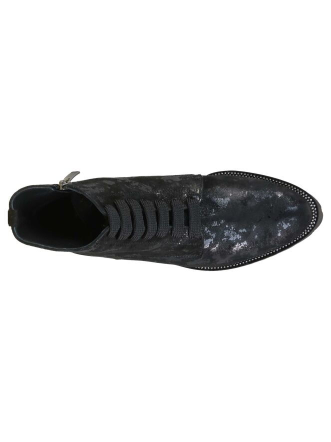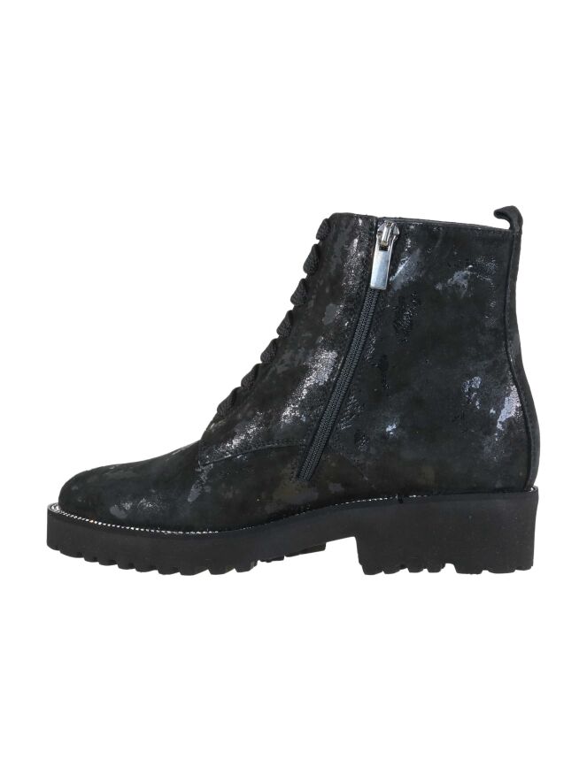 Sportliche Schnürstiefelette der Designerschuhmarke Evaluna im Military-Look in verschiedenen Schwarztönen. Ein mit Strass besetzter Streifen akzentuiert den Rand der Sohle. An der Innenseite ist ein Reißverschluss. Die Stiefelette hat ein Innenfutter aus Leder.