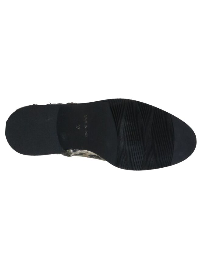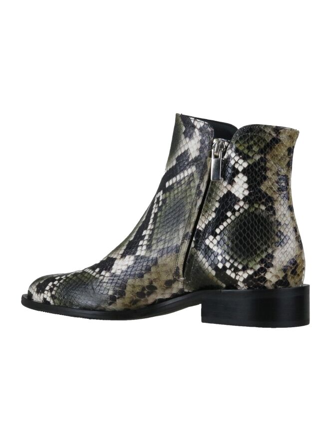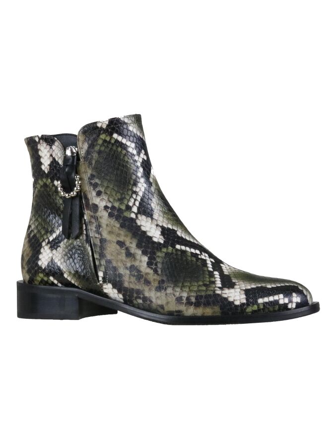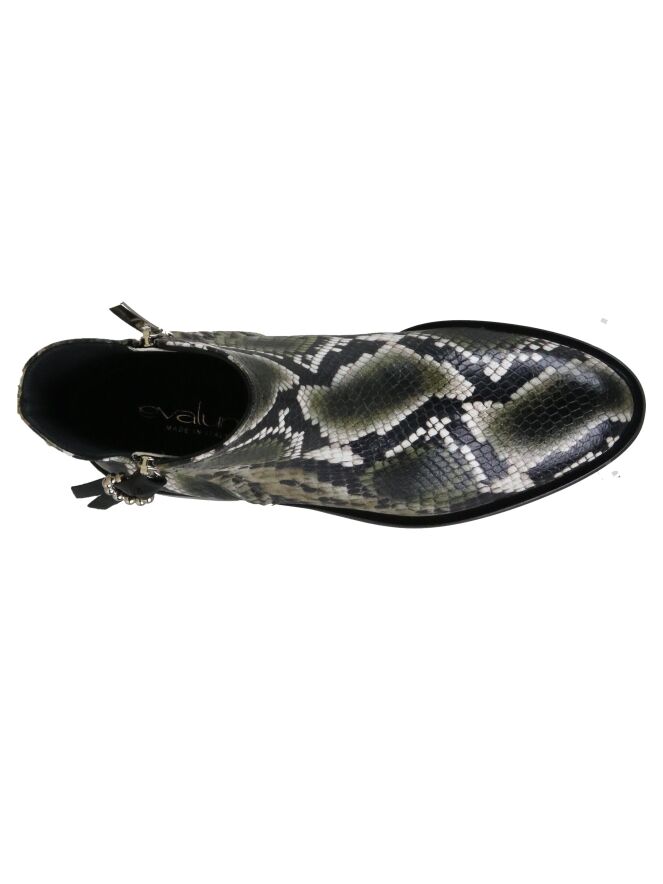Eine Stiefelette der Damenschuhmarke Evaluna mit Schlangenmuster in Schwarz-weiß und verschiedenen Grüntönen. An beiden Seiten befindet sich ein Reißverschluss. Die vorne abgerundete Stiefelette hat ein Innenfutter aus Leder.