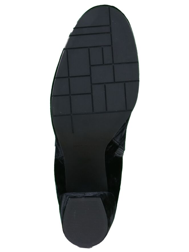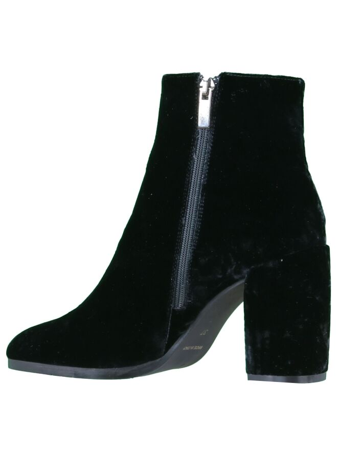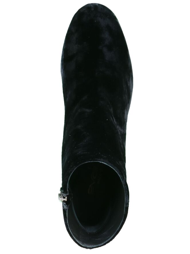 Schwarze Stiefelette der Designerschuhmarke Evaluna. Die Stiefelette ist vorn abgerundet und mit einem eleganten Blockabsatz versehen, der mit demselben Samtmaterial wie die Stiefelette bestückt ist. Die Schafthöhe beträgt ab der Ferse 10 cm, der Umfang misst 28 cm. Das Innenfutter der Stiefelette ist aus Leder.