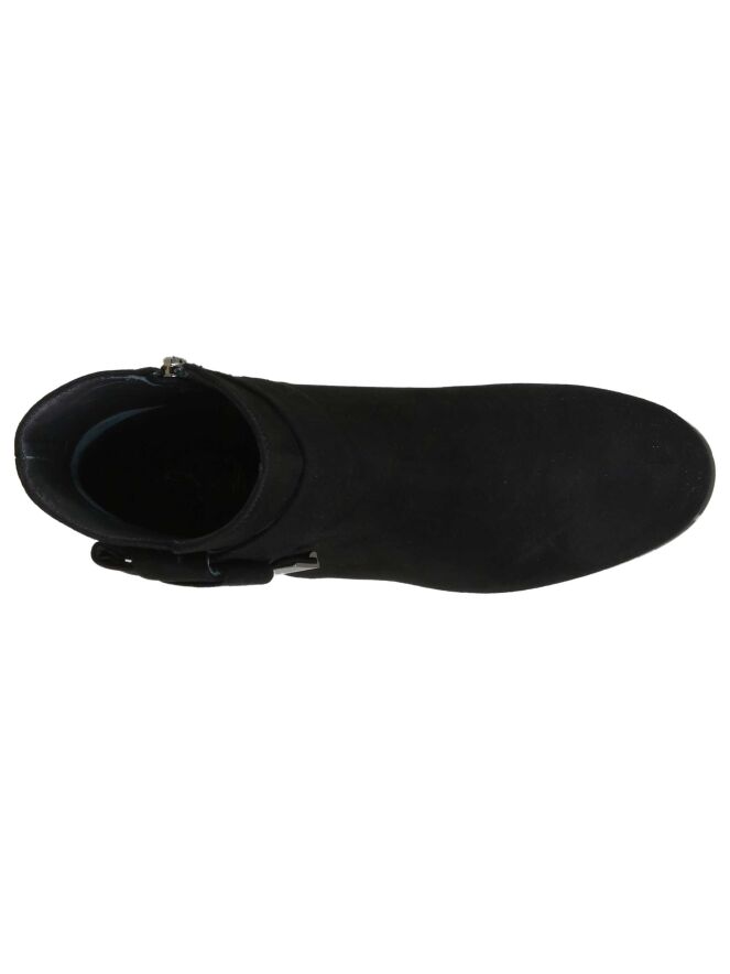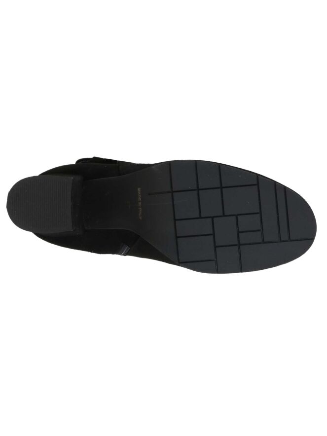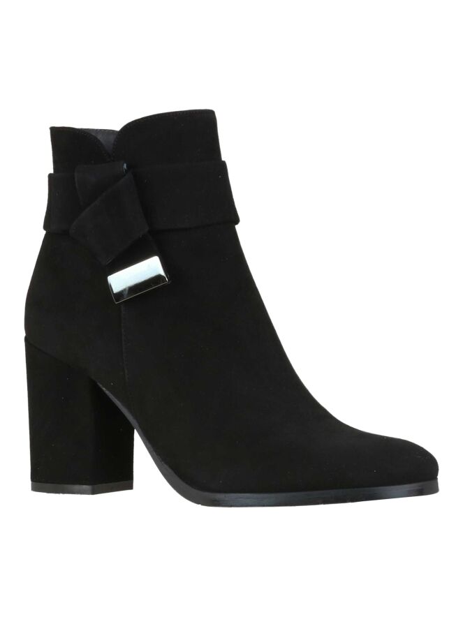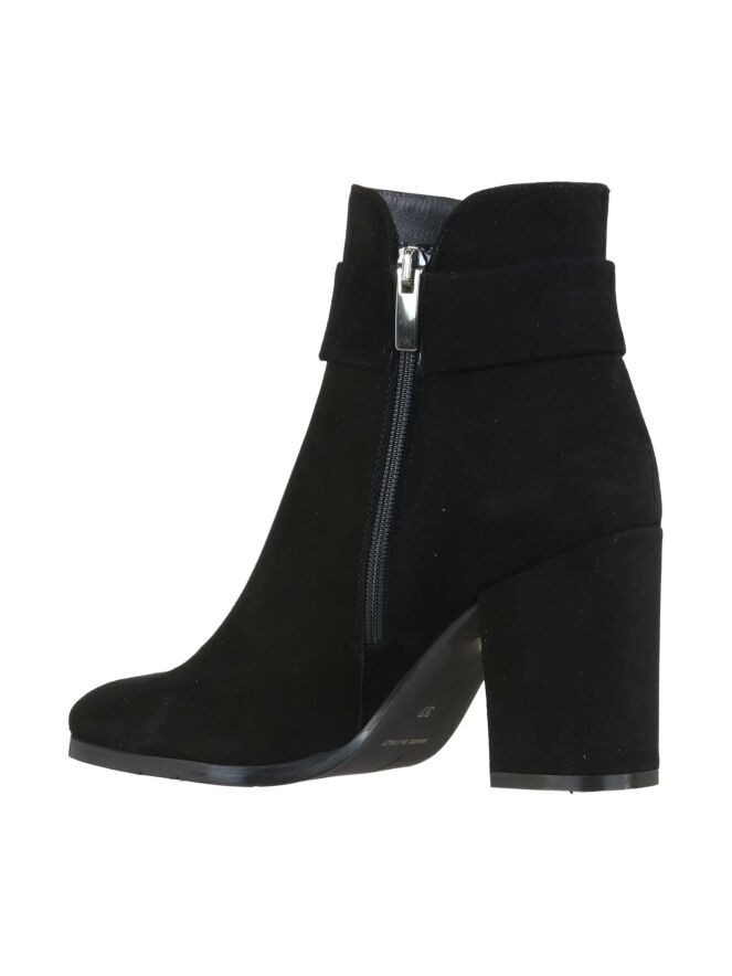 Schwarze Stiefelette der Designerschuhmarke Evaluna. Um den Schaft herum verläuft ein Band mit Schlaufe und einer nickelfarbigen Schnalle am Ende. Die vorn abgerundete Stiefelette kommt mit einem runden Blockabsatz. Die Stiefelette hat ein Innenfutter aus Leder.