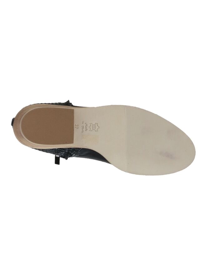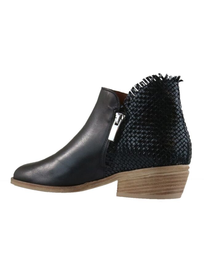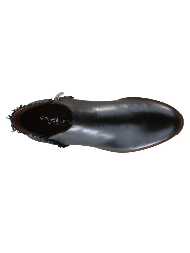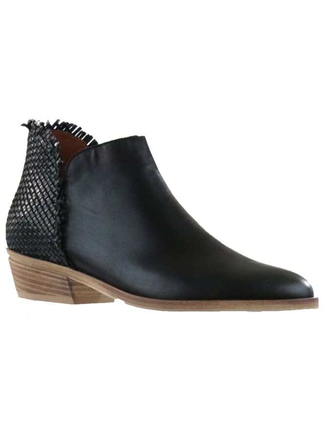 Eine Stiefelette der Schuhmarke Evaluna in Schwarz. Die Ferse und die Seiten sind aus geflochtenem Leder, das an der Schaftkante ausgefranst ist. Die Stiefelette hat ein Innenfutter aus Leder.