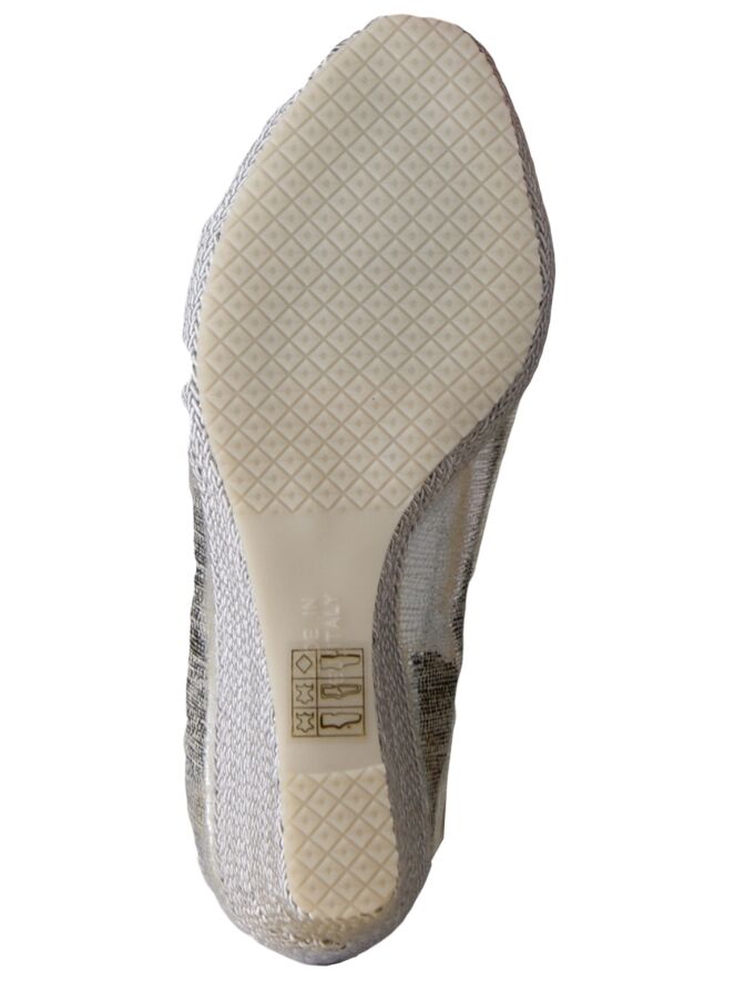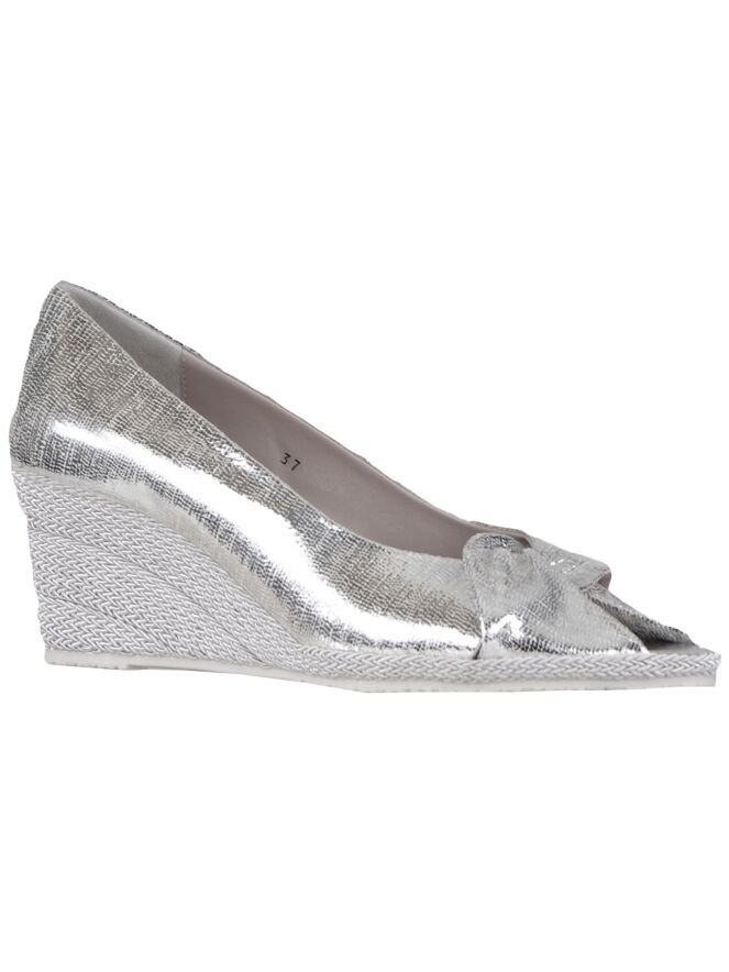 Silberfarbene Espadrilles der Designerschuhmarke Even & Odd. Der Espadrille ist vorn offen, und das Leder ist über dem Vorfuß gekreuzt. Das Innenfutter ist aus Leder. Der Keilabsatz ist mit einem fein geflochtenen Stoff beschichtet.