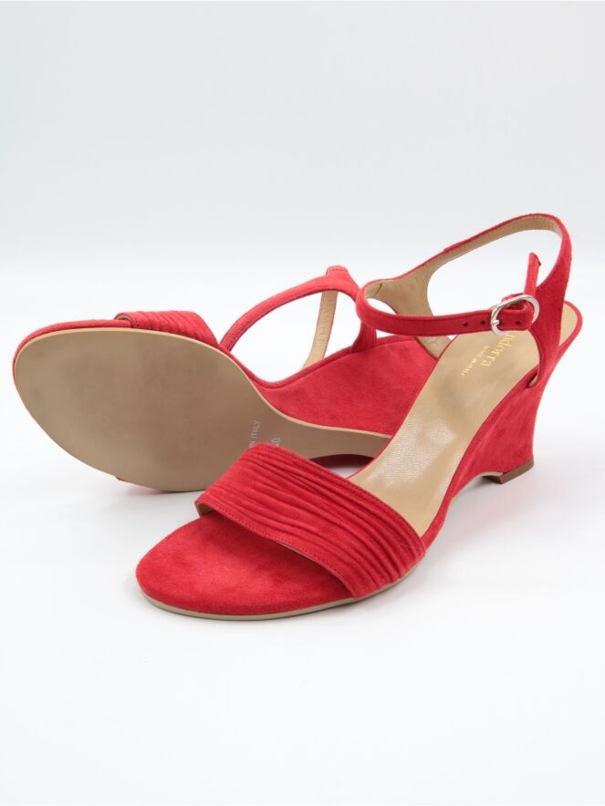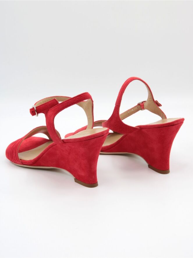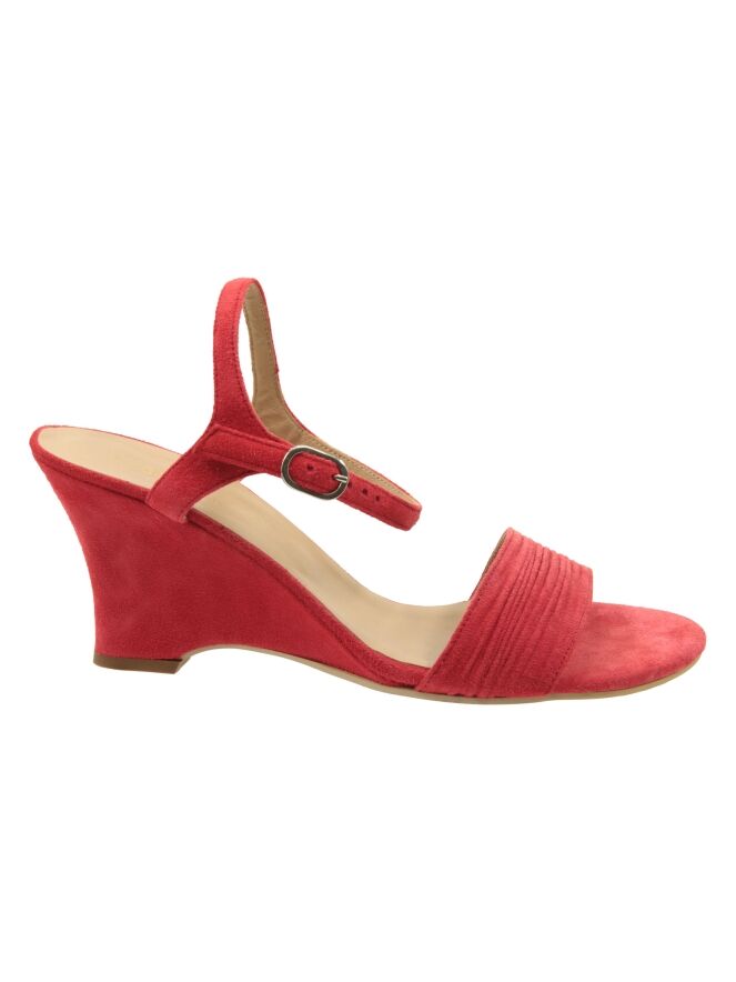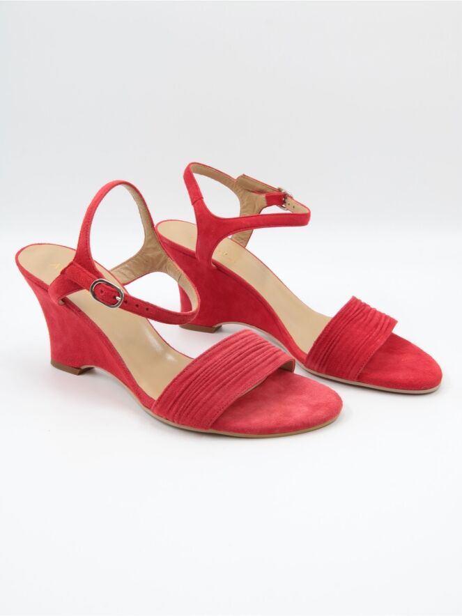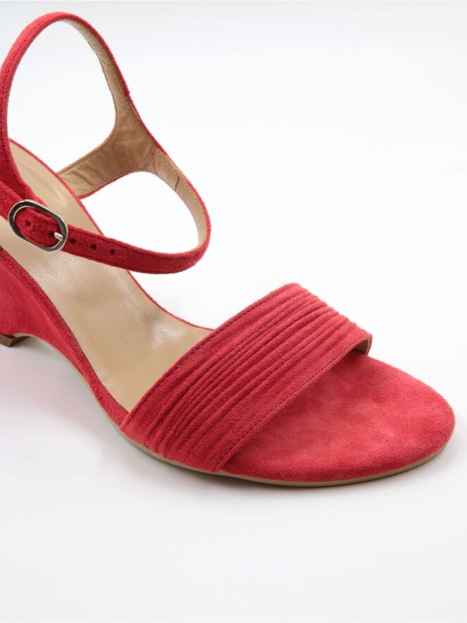 Eine Sandale mit offener Spitze von Even and Odd in Korallenrot. Der Keilabsatz ist mit demselben Material wie die Sandale überzogen. Der breite Riemen über dem Vorderfuß ist fein gerippt. Der Fersenriemen ist verstellbar.