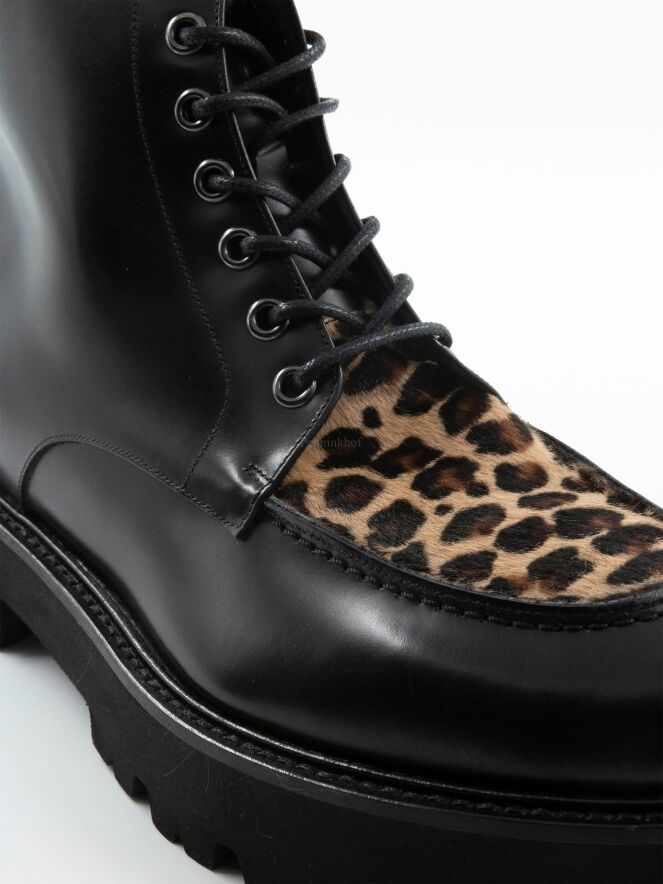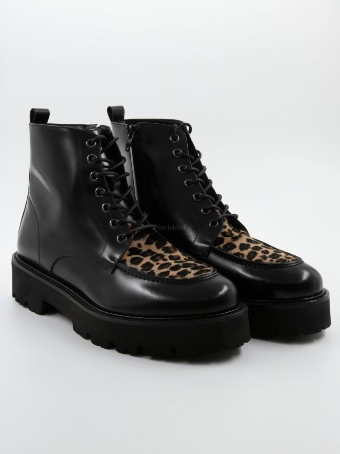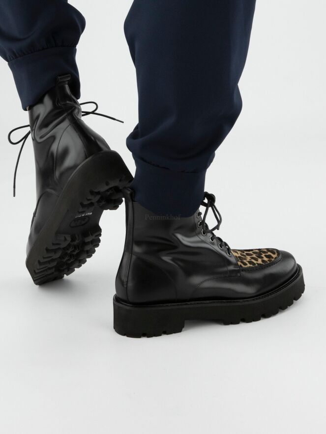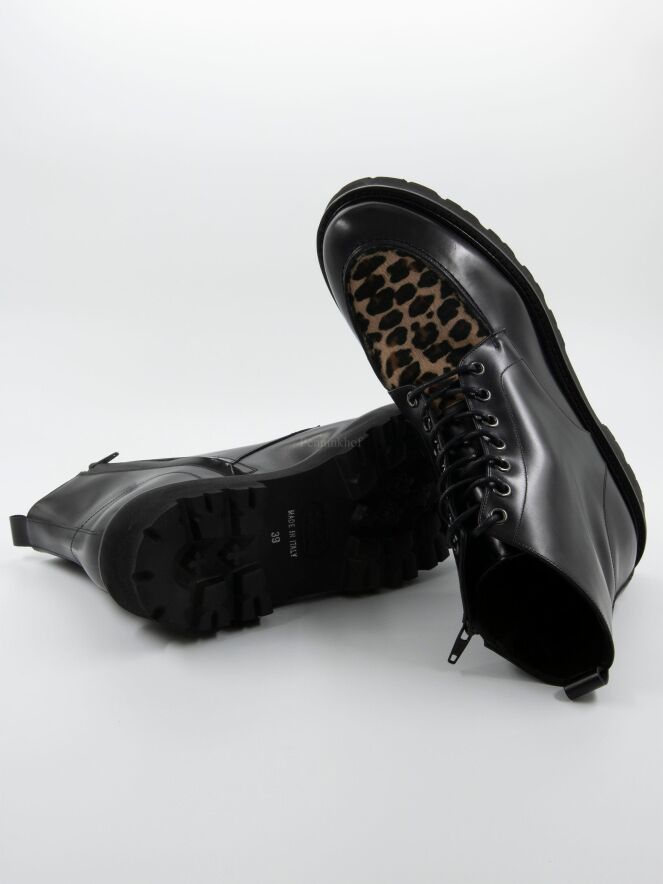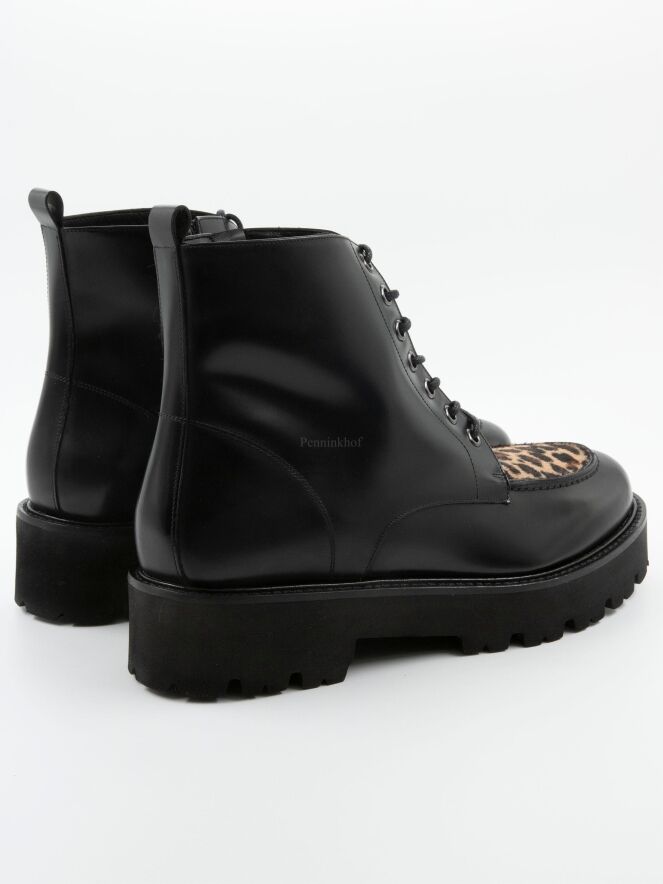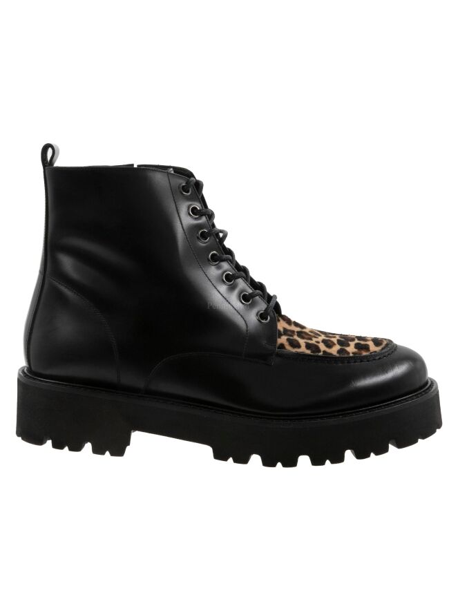 Ein Schnürstiefel von Even and Odd (Pascucci) aus schwarzem Leder. Am Vorderfuß befindet sich ein rasiertes Ponyfell im Leopardenmuster. Die Sohle ist gerippt und innen mit Leder gefüttert.