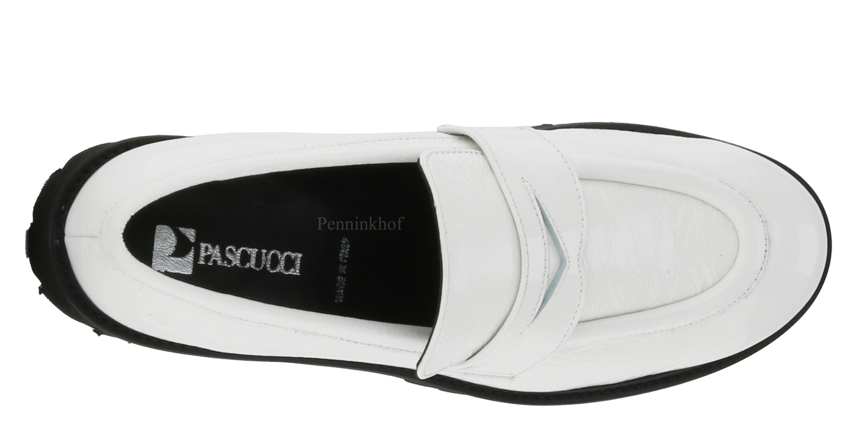 Ein Slipper der Schuhmarke Even and Odd aus weißem Wrinkle-Lack. Die Plateausohle ist gezackt. Die Innenseite ist mit Leder gefüttert.