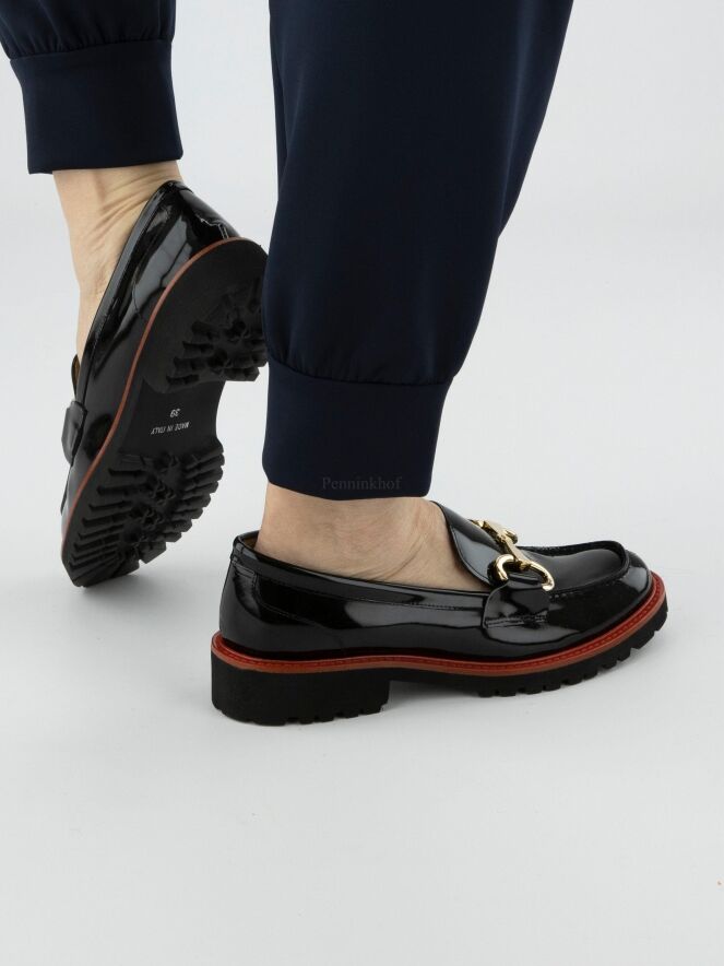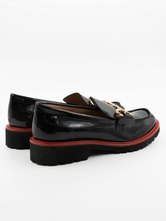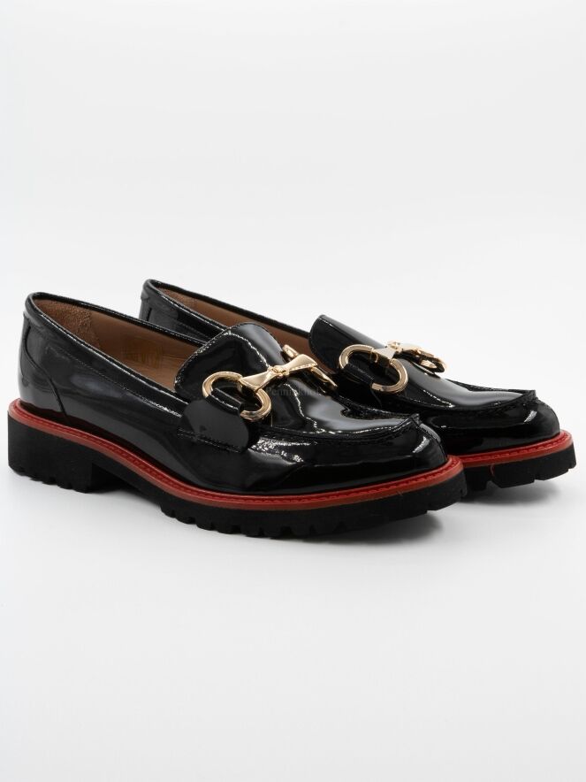 Ein Halbschuh von Even and Odd (Pascucci) aus schwarzem Lackleder. Auf dem Vorderfuß befindet sich eine Schnalle in einem zarten Goldton. Der Rand der gerippten Sohle ist rot. Die Innenseite ist mit Leder gefüttert.