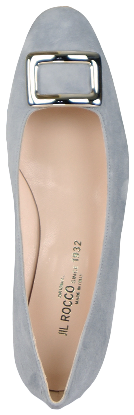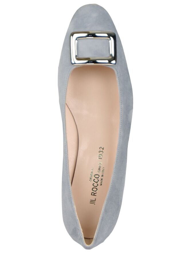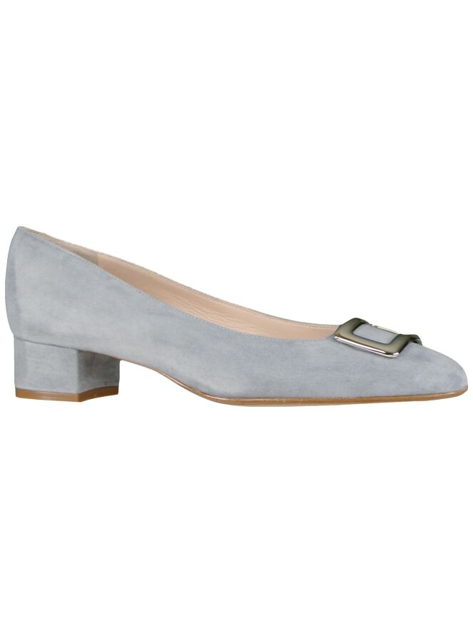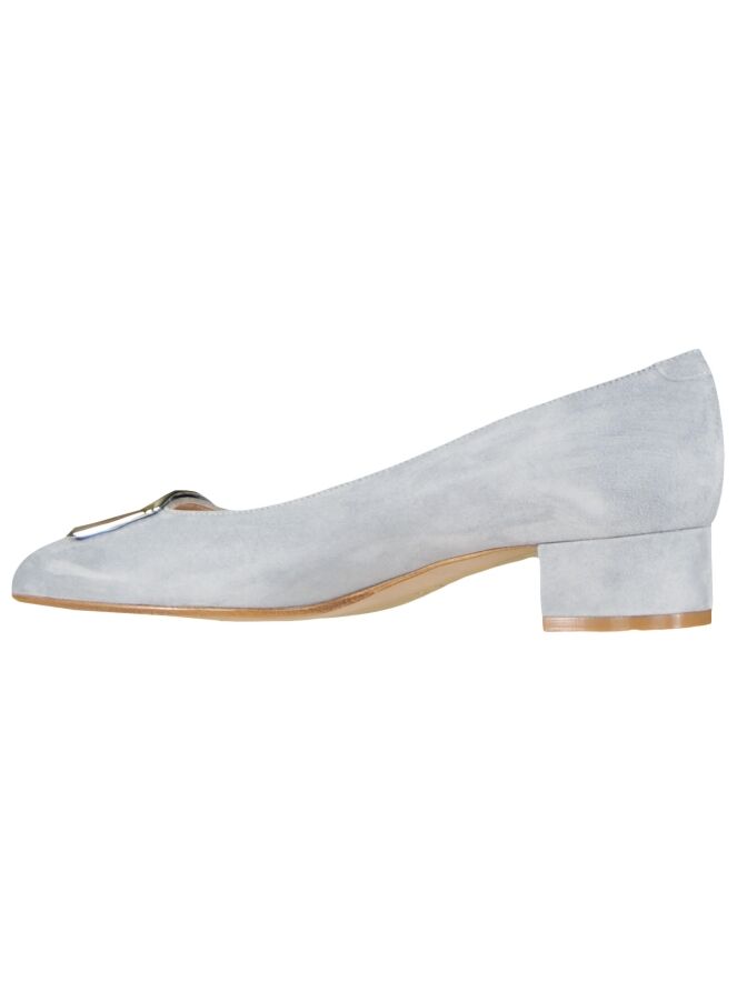 Hellgraue Pumps der Designerschuhmarke Even & Odd. Der vorn abgerundete Pumps ist mit einer silberfarbenen, eckigen Schnalle verziert. Der Absatz ist mit demselben Wildleder bestückt wie der Pumps. Der Pumps hat ein Innenfutter aus Leder.