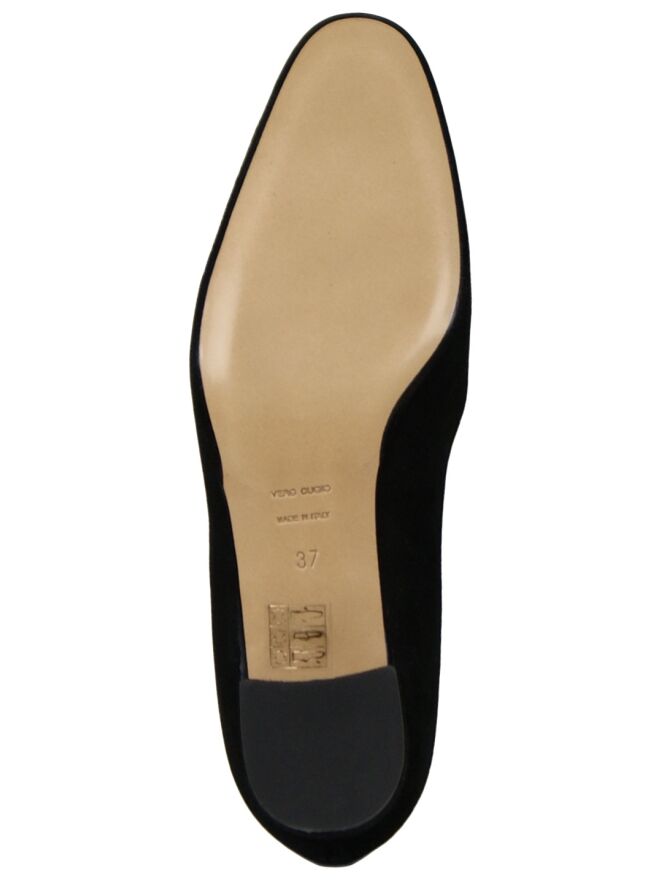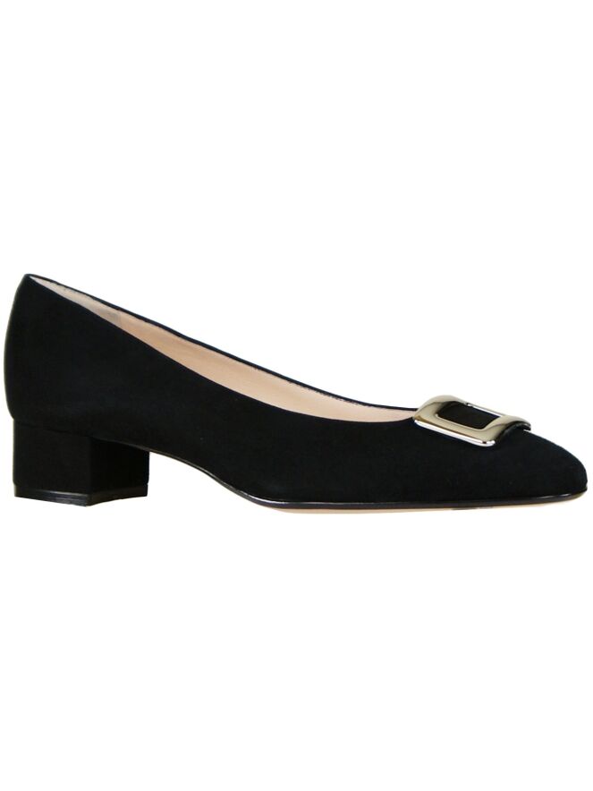 Schwarzer Pumps der Designerschuhmarke Even & Odd. Der vorn abgerundete Pumps ist mit einer silberfarbenen, eckigen Schnalle verziert. Der Absatz ist mit demselben Wildleder bestückt wie der Pumps. Der Pumps hat ein Innenfutter aus Leder.