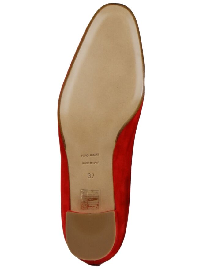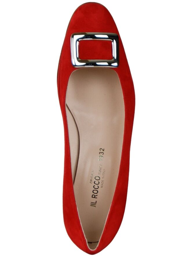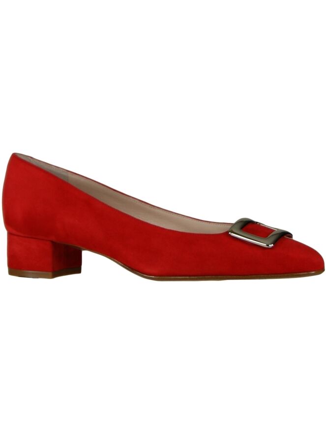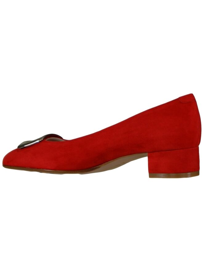 Roter Pumps der Designerschuhmarke Even & Odd. Der vorn abgerundete Pumps ist mit einer silberfarbenen, eckigen Schnalle verziert. Der Absatz ist mit demselben Wildleder bestückt wie der Pumps. Der Pumps hat ein Innenfutter aus Leder.